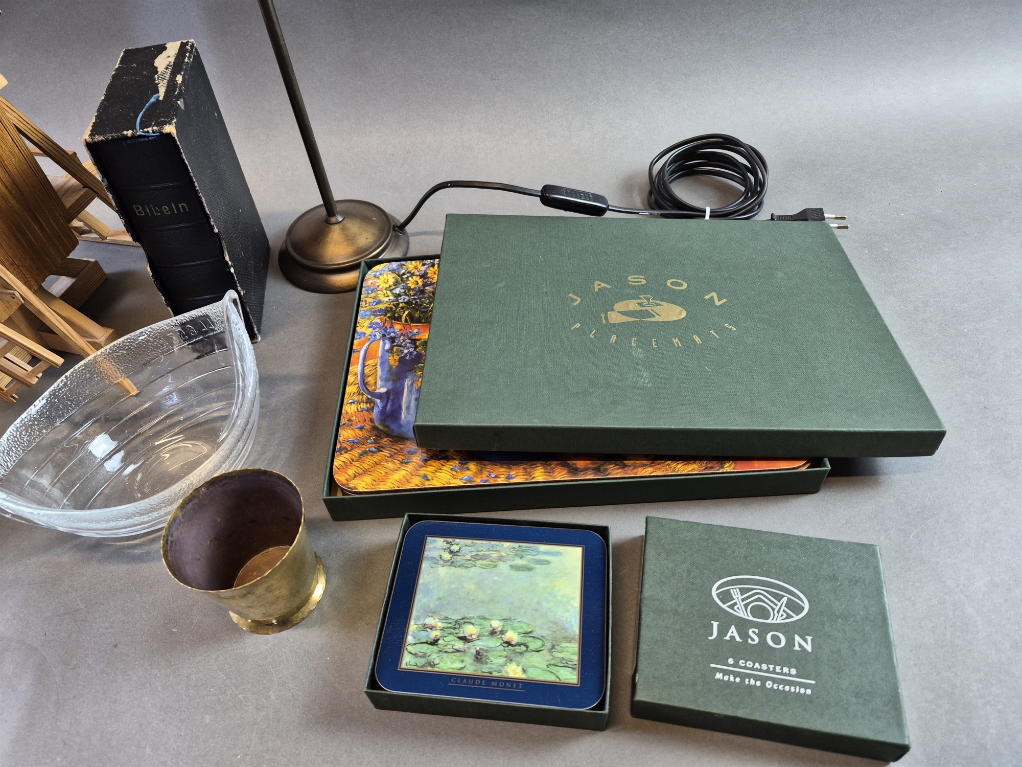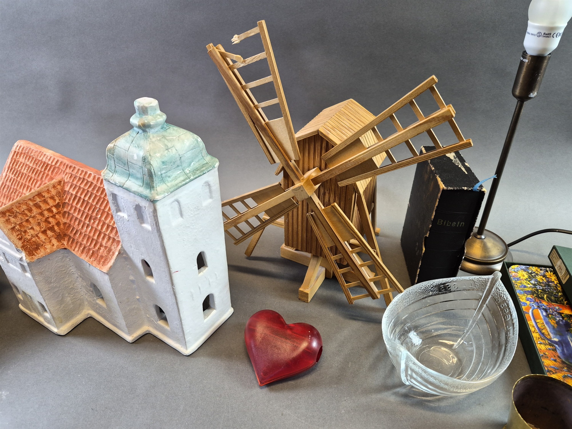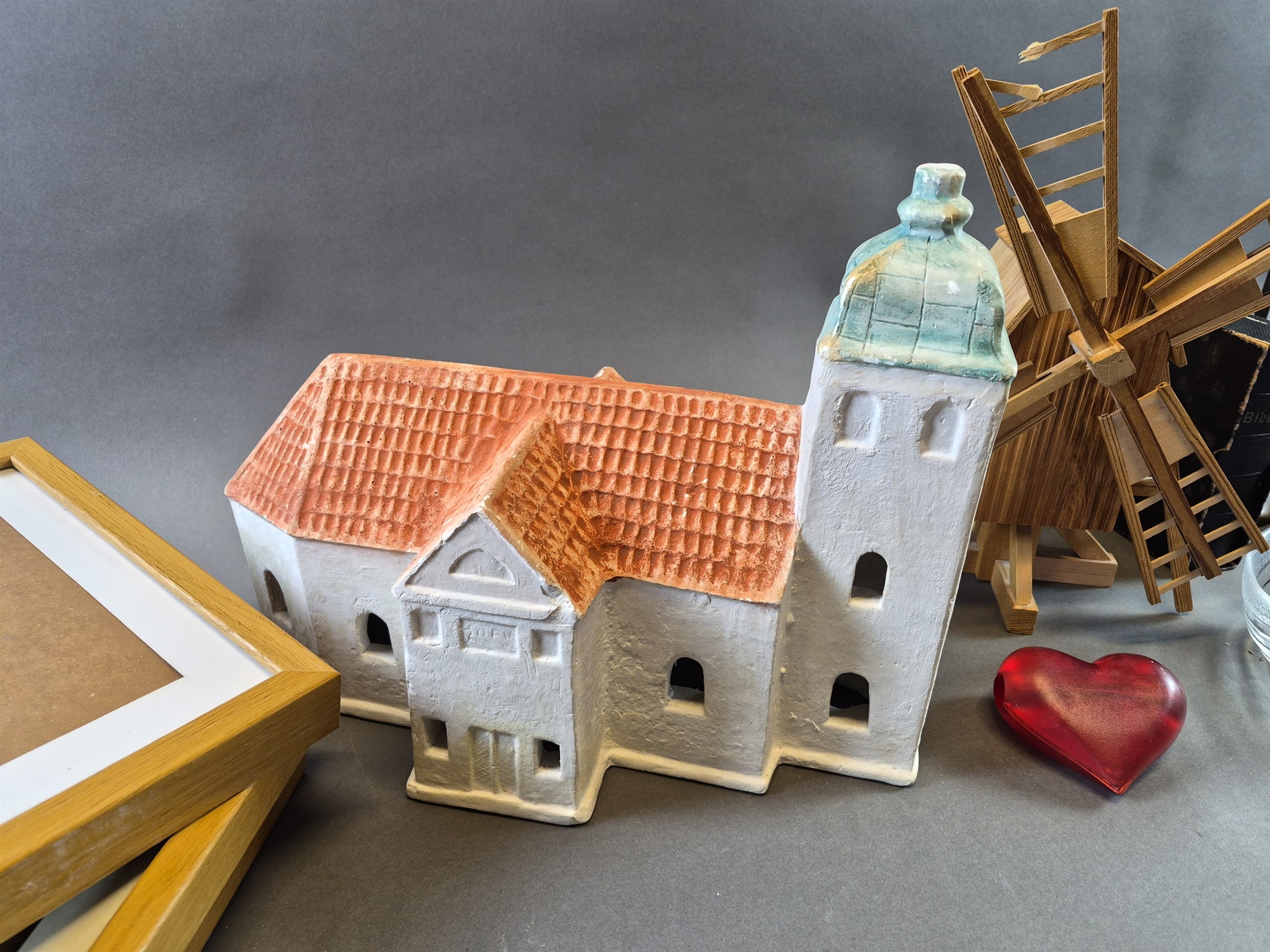 Bilder Parti bla gipskyrka, bordstabletter och ramar, högsta höjd 39 cm