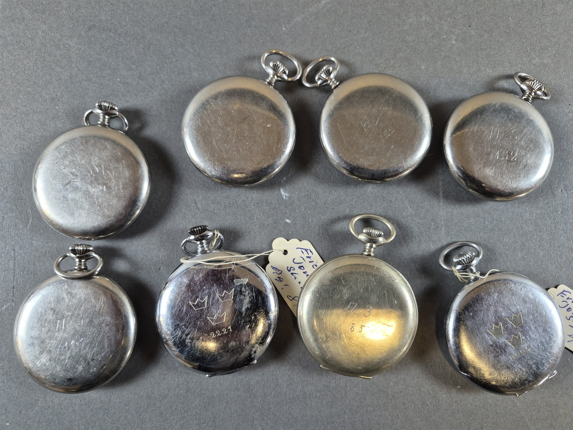 Bilder Fickur, 8 st bl.a Drott, Arme, stålboetter, diameter 5 cm