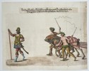 "Des Durchleuchtigen Hochgebornnen Fursten unnd Herrn Joachim Ernsten Marggrauen zu Brandenburg Auffzug zum Ringrennen". This work depicts a ceremonial procession from the wedding festivities of Duke Johann Friedrich of Württemberg and Barbara Sophia of Brandenburg. The scene features a knight in ornate classical armor holding a staff, followed by two figures dressed as satyrs or wild men leading horses. This hand-coloured etching is from the commemorative volume Repraesentatio der Furstl. Auffzug unnd Ritterspiel, published in Schwäbisch Gmünd in 1611. The series documents the elaborate pageantry, including tournaments and allegorical parades, held in Stuttgart in November 1609.