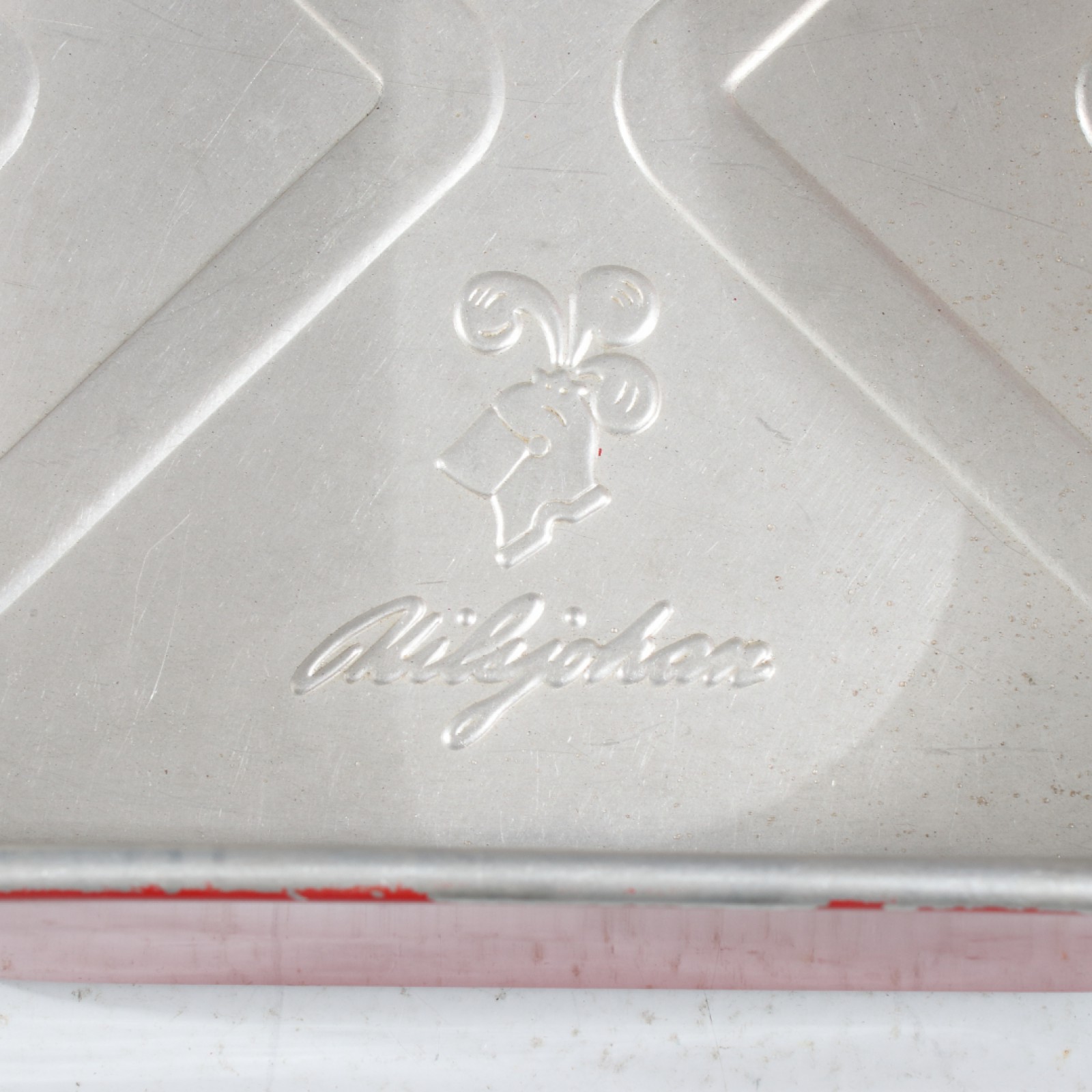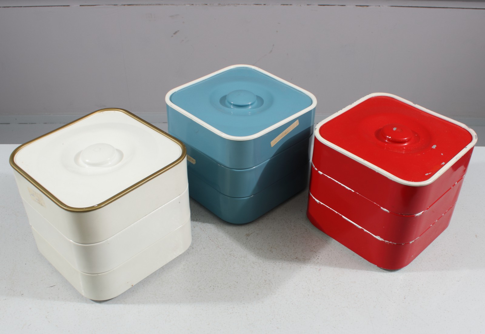 3 stycken, lackerad plåt, 3 våningar, 1960-tal, den röda ställvis med färgbortfall, höjd 20 cm, bredd 23x23 cm. (vån3)