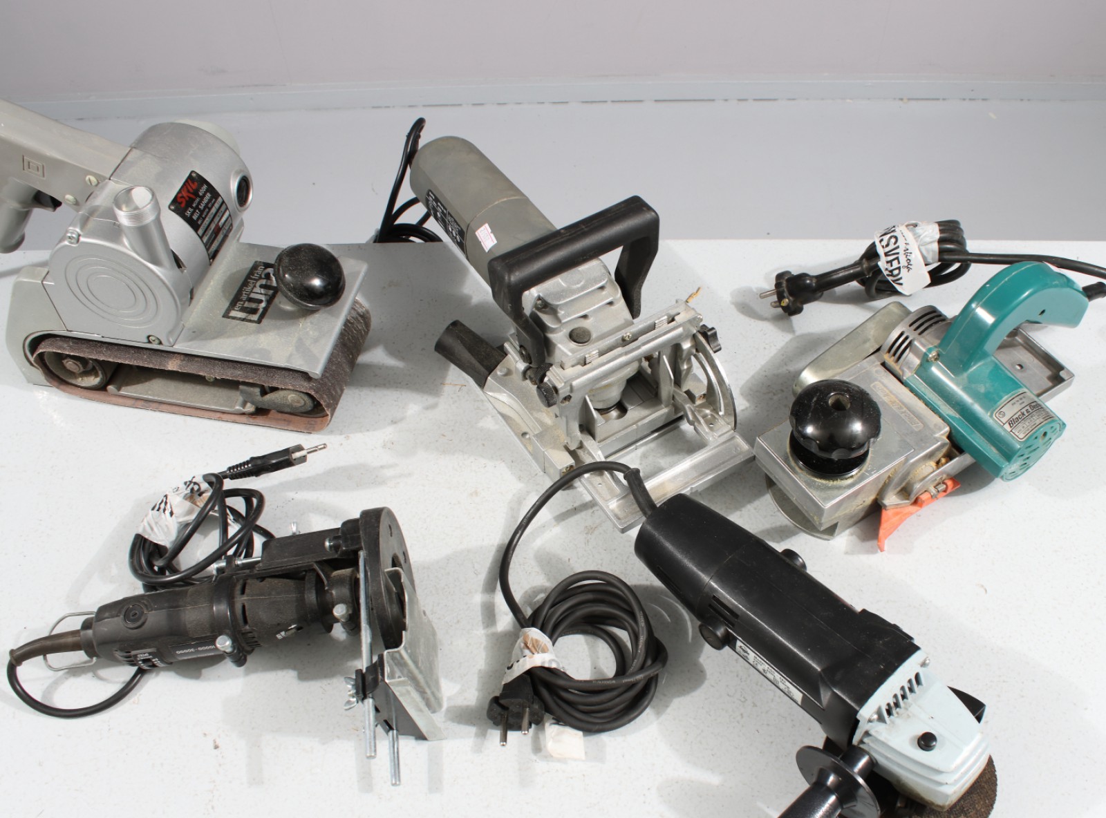 5 delar, 1st lamellfräs, 1st slipmaskin, 1st hyvel, 1st vinkelslip samt 1st Dremel, samtliga fungerar vid test, bruksslitage. (vån3)