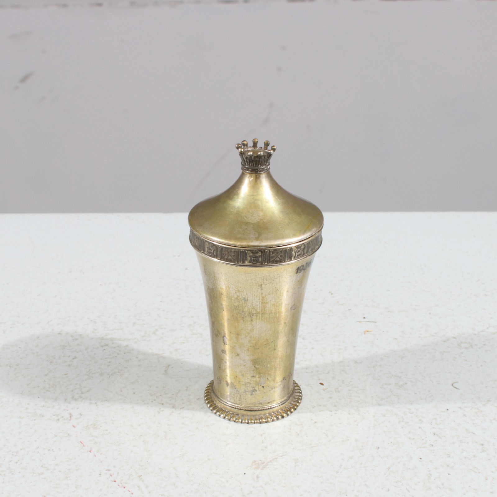 Kontrollerat silver, C.G. Hallberg, Stockholm, 1936, Gåvogravyr, höjd med lock 14 cm, vikt 140 gram. (vån3)