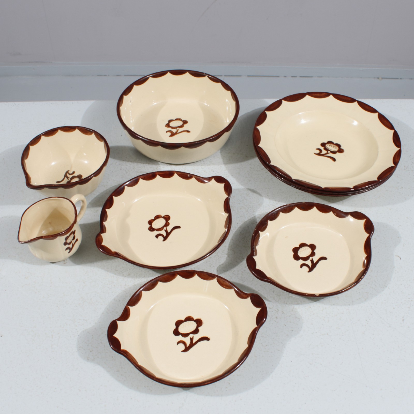 9 delar, 3st djupa tallrikar Nr:153, 1st form Nr:20, 1st form Nr.39, 1 par formar Nr:381st gräddkanna Nr132 samt 1st skål med pip Nr:97, några mindre enstaka glasyrnagg förekommer. (vån3)