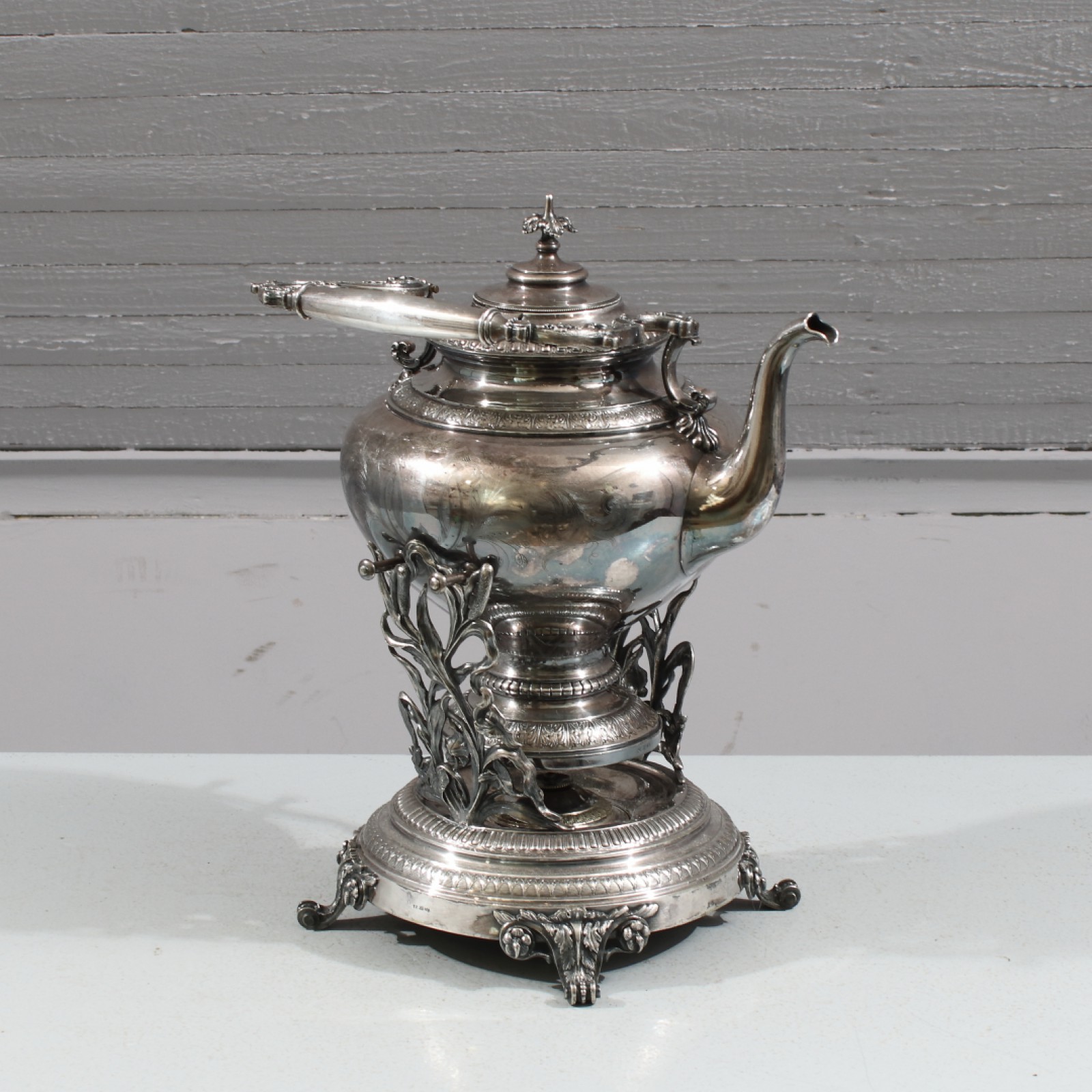 Nysilver, 1900-talets första del, mindre åldersrelaterat slitage, höjd tekanna utan handtag ca:29 cm, höjd med rechaud ca:40 cm. (vån3)