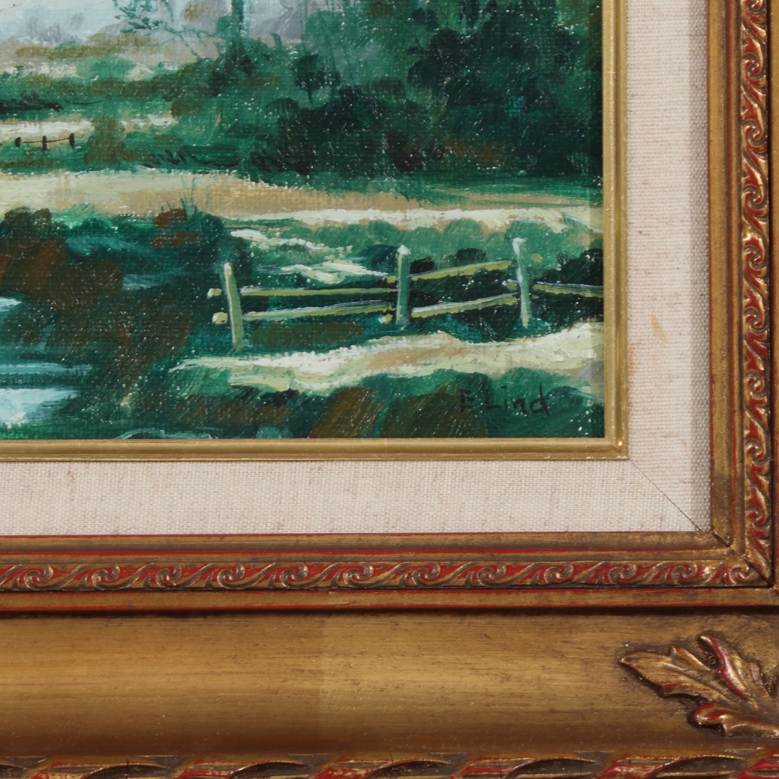 Olja på duk, "Naturscen", signerad E. Lind, ram 43x48 cm, bild 21x26 cm. (vån3)