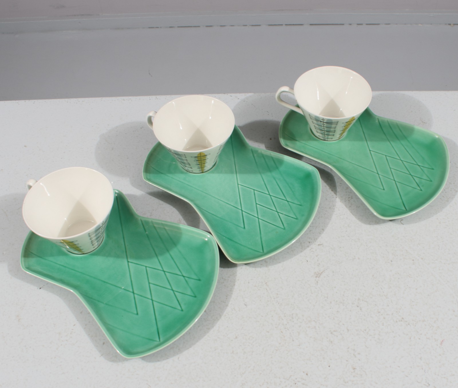 6 delar, 3st kaffekoppar samt 3st fat, 1950,60-tal, höjd kopp 6,7 cm, fat 22,5x16 cm. (vån3)