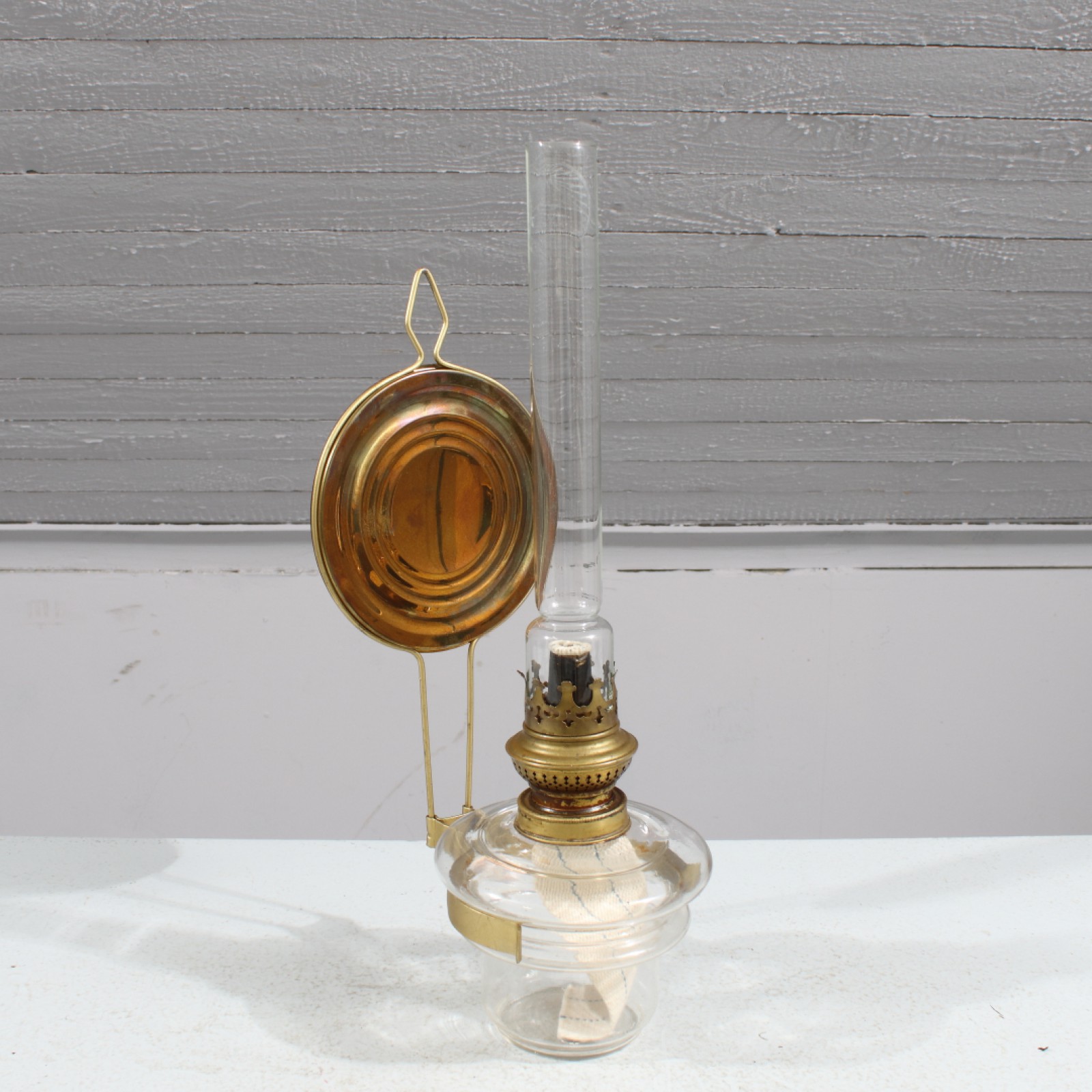 Stomme i metalltråd, reflektor i plåt, oljehus och brännarrör i glas, höjd 40 cm. (vån3)