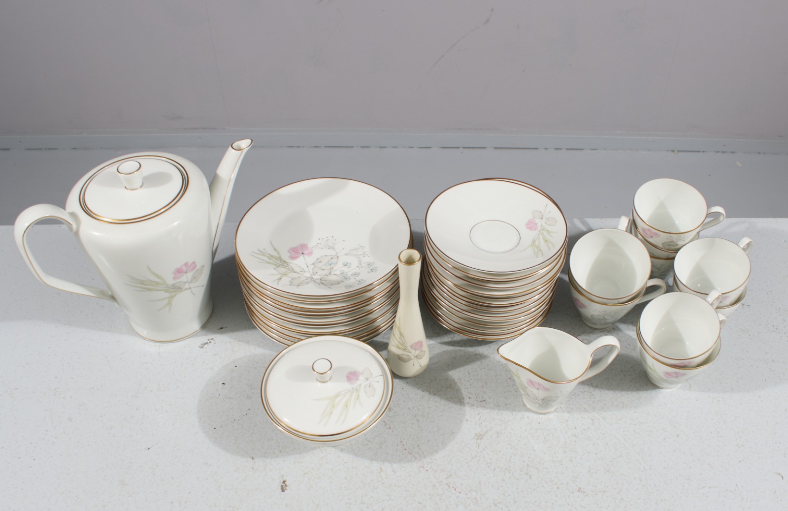 40 delar, 9st kaffekoppar, 15st kaffefat, 12st assietter, 1st kaffekanna, 1st sockerskål med lock, 1st gräddkanna samt 1st mindre vas. (vån3)