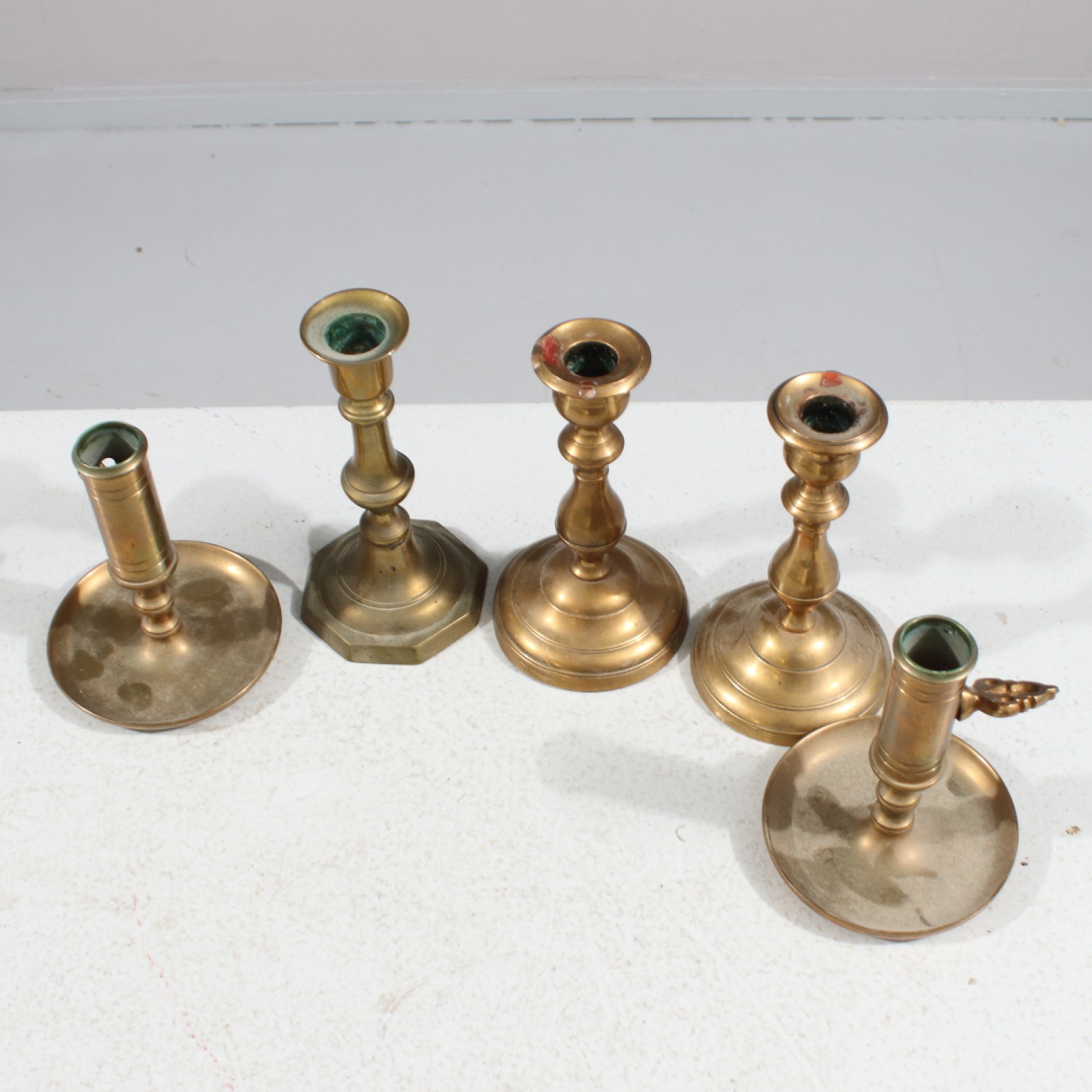 5 stycken, mässing/malm, 1 par Skultuna No:13 1800-talets andra hälft, 1 par Ekbergs samt 1st omärkt, höjd 12-15 cm. (vån3)