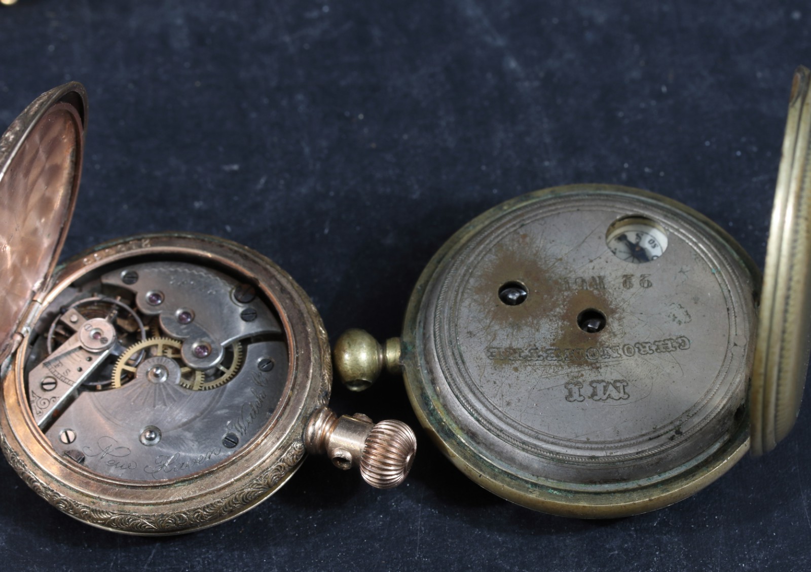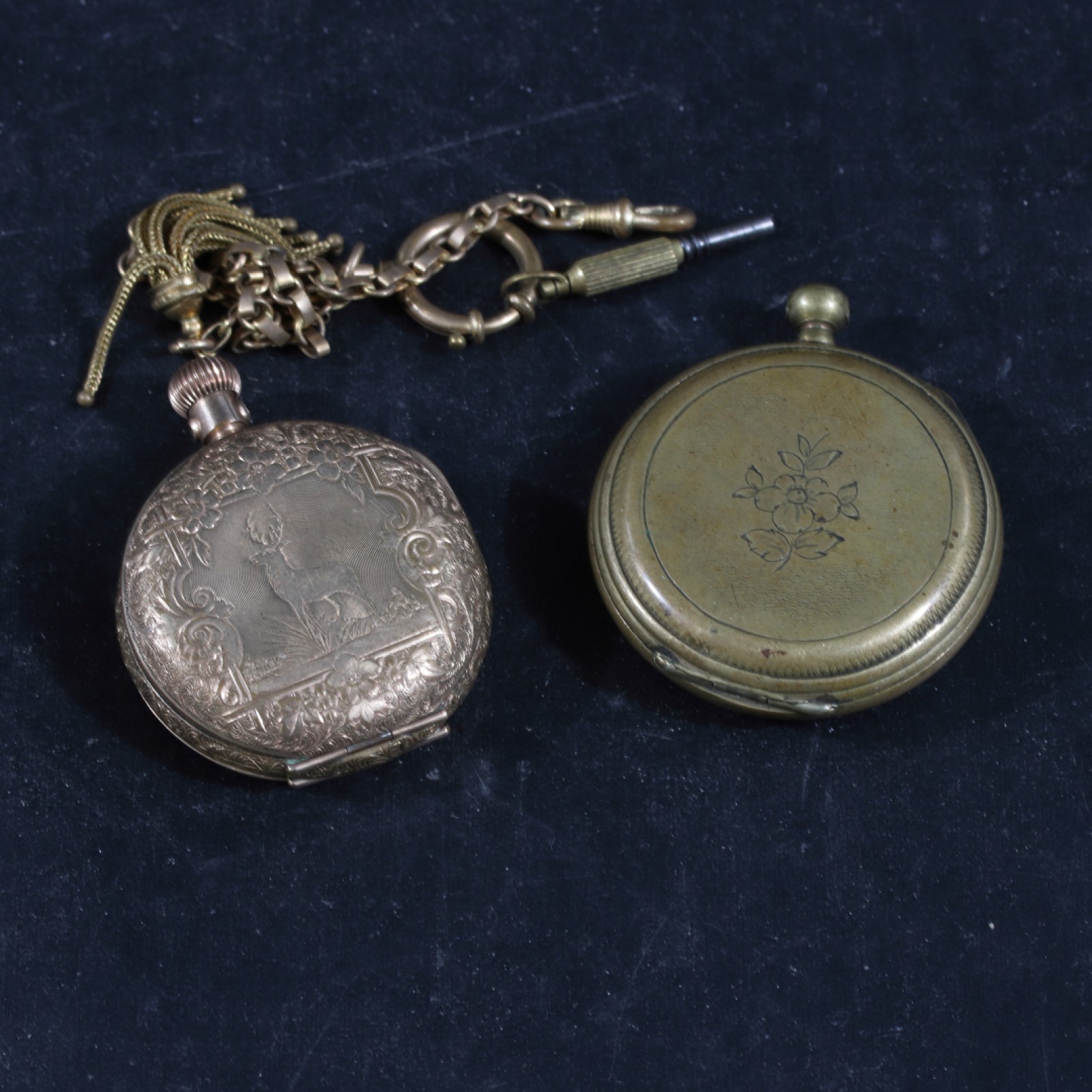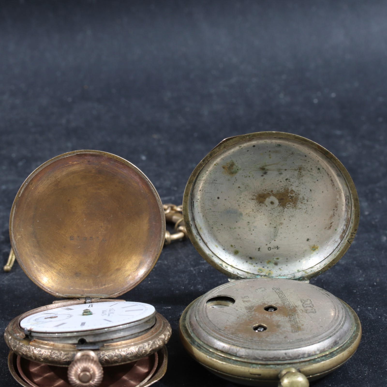 2 stycken, metall, manuella, 1st med nyckeluppdrag samt 1st savonett, 1st klockkedja med nyckel medföljer, savonett saknar glas och visare samt skador på urtavla, ej gångbara vid kontroll (ingen garanti lämnas), bredd 42-47 mm. (vån3)