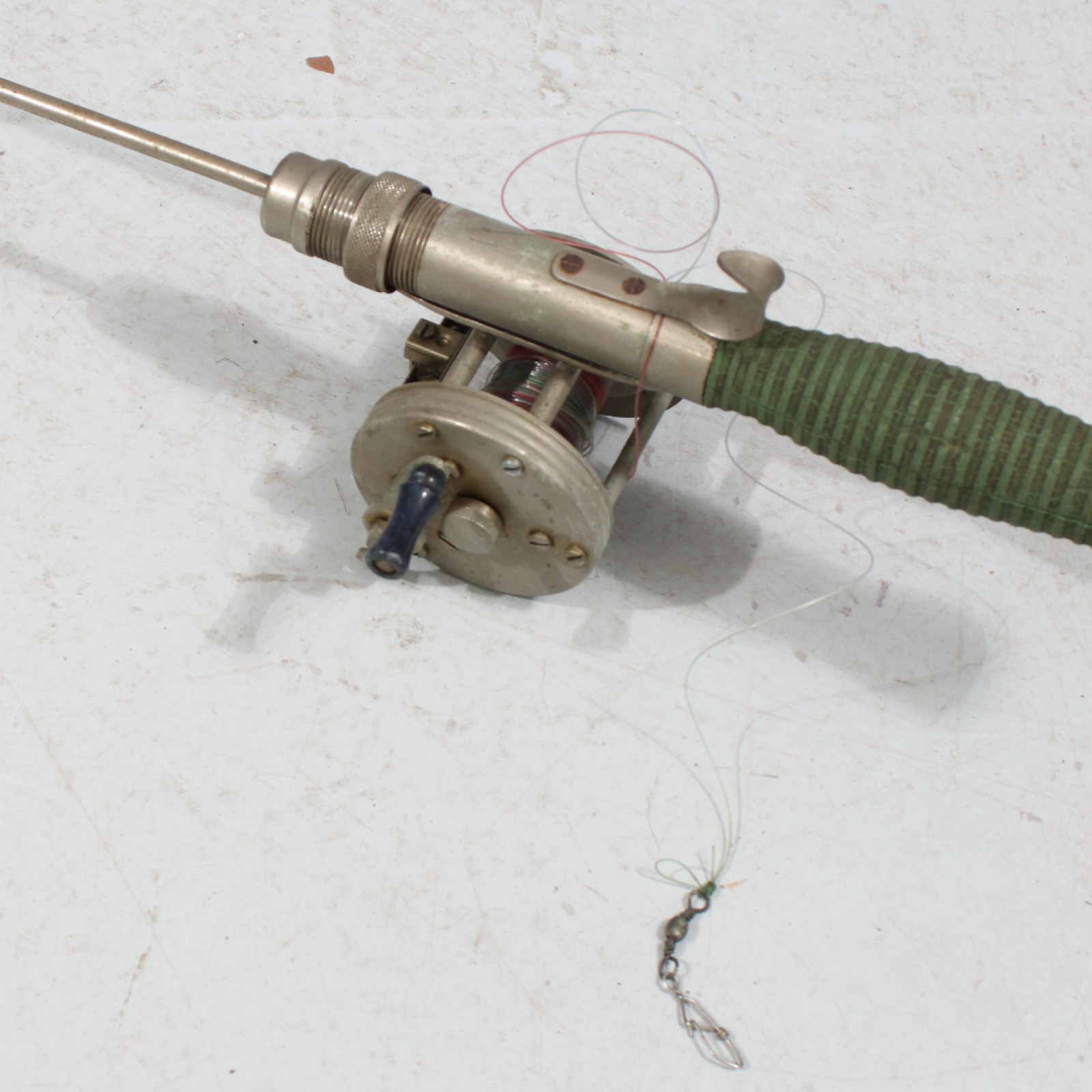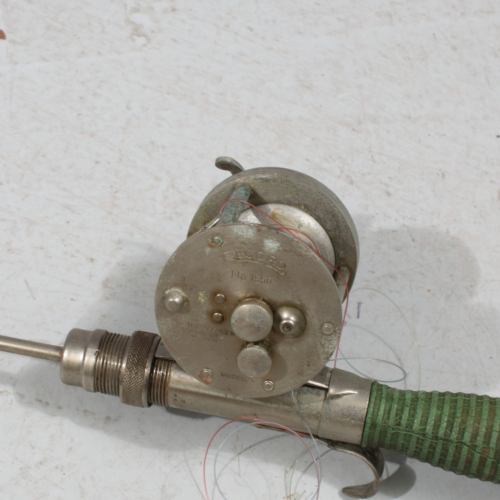 1st spö "Record 22" samt 1st rulle "Record No.1500 modell C", 1900-talets mitt, 1st pinne saknas på rulle, åldersrelaterat slitage, längd spö 135 cm. (vån3)