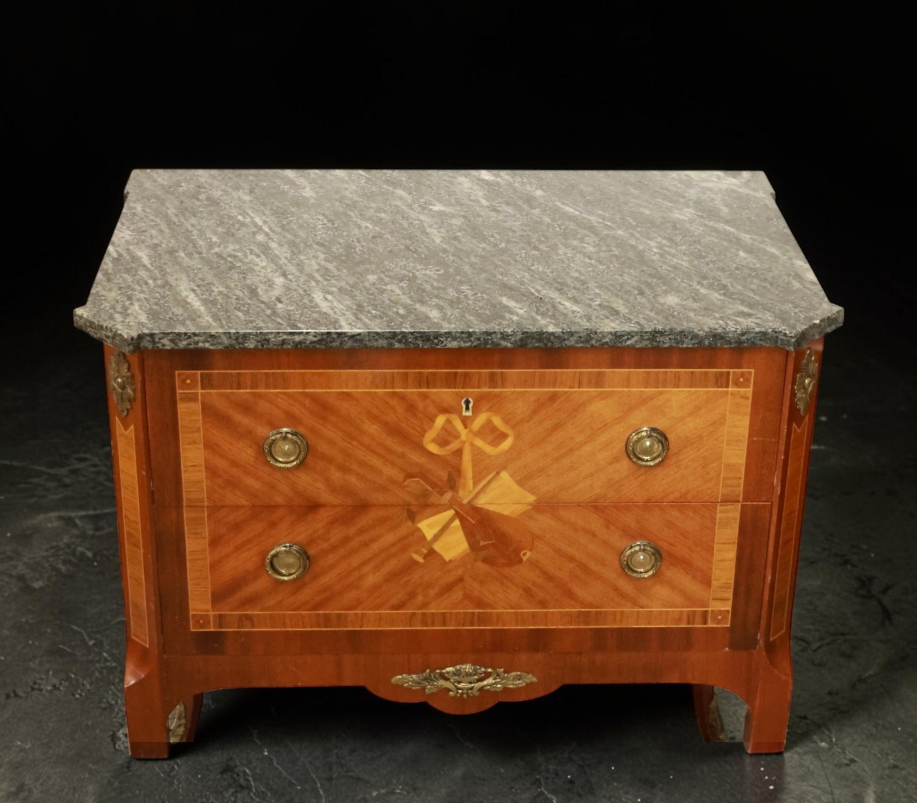 Byrå med intarsia, mässingsbeslag, stenskiva och två lådor