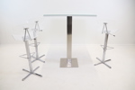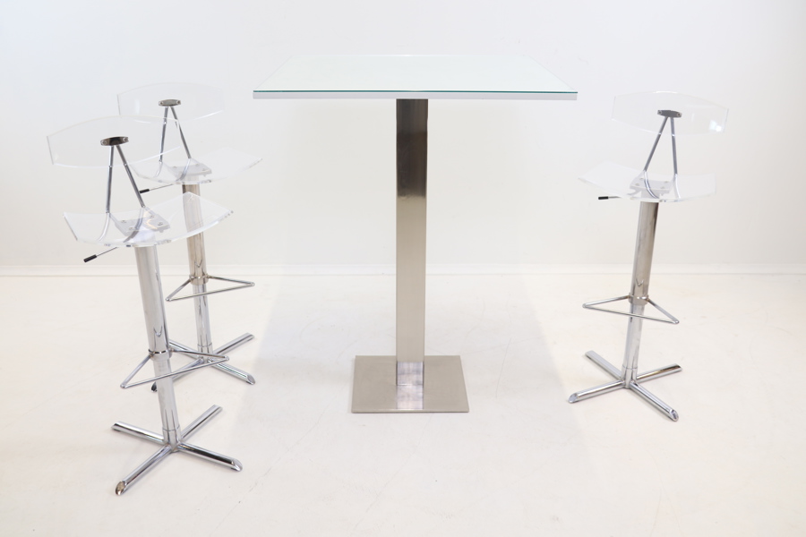 Bord, metall/glas, samt barstolar, 3 st, höj/sänkbara, metall/plast.