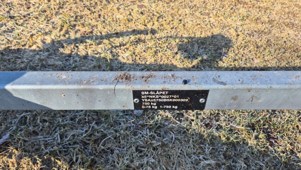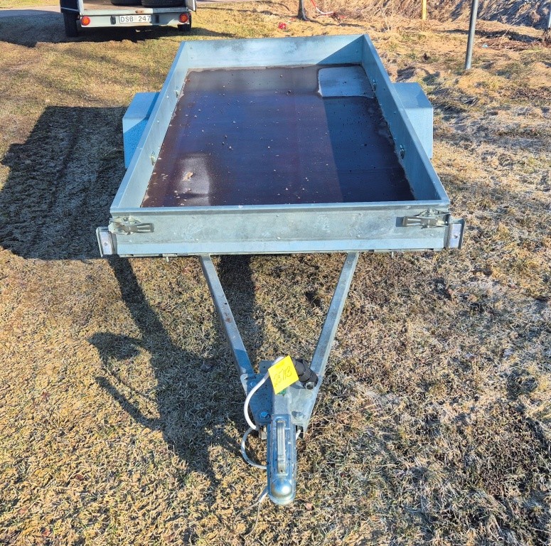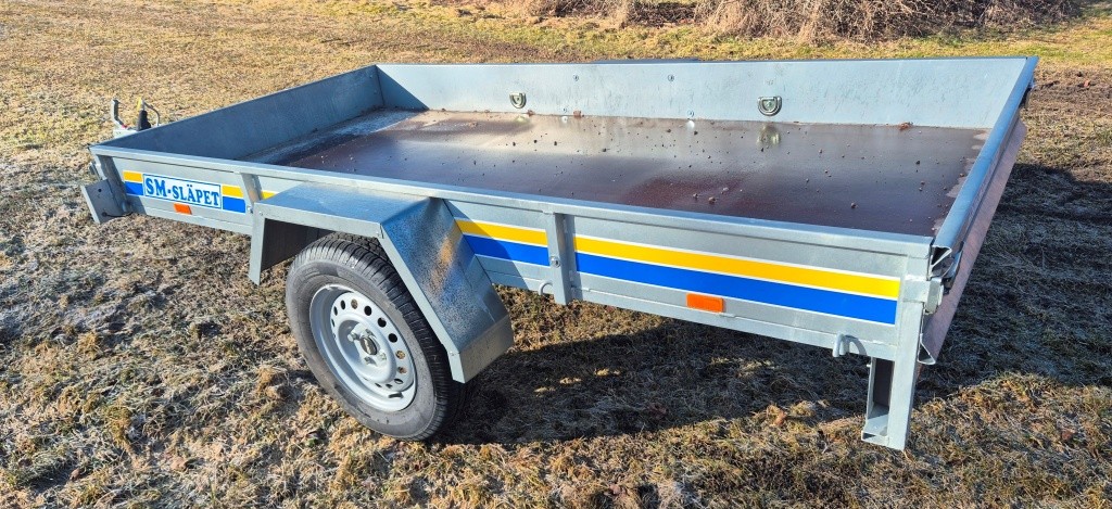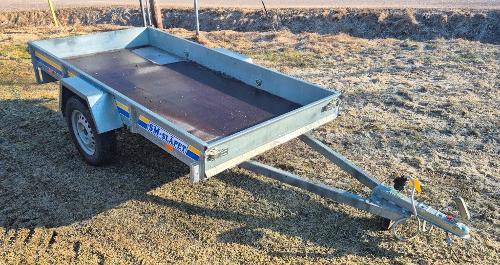 Släpvagn SM-släpet Regnr: APY13WLastmått: 127x251 cmTotalvikt: 750kgMax lastvikt: 585 kgEndast sommardäck