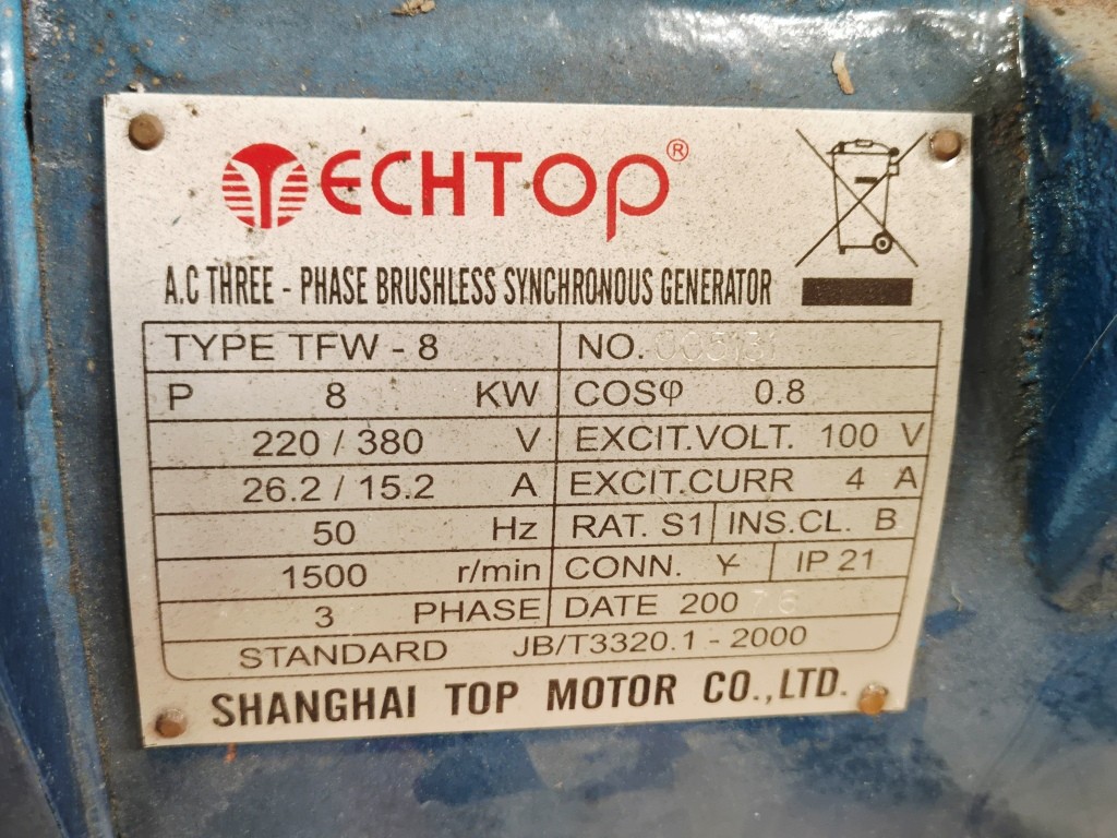 Generator TechtopModell TFW-8220V (26,2A)380V (15,2A)Driftvarv: 1500 rpm