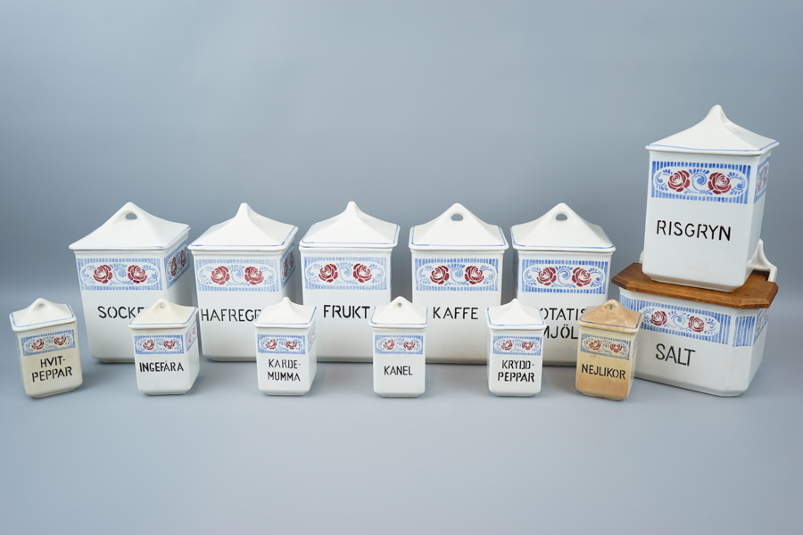 Speceriburkar, 13 st, porslin/trä, Rörstrand.