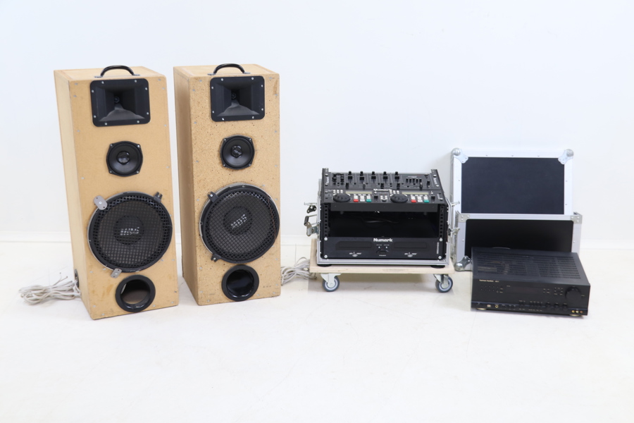 Bilder DJ-utrustning, Numark CM100, förstärkare, Harman/Kardon AVR21, samt ett par högtalare.