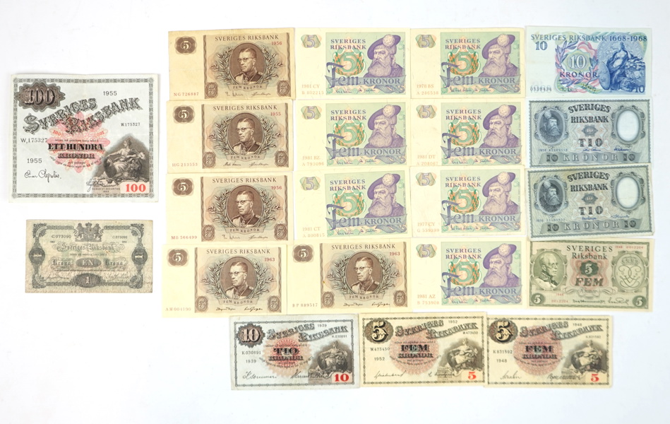 Sedlar, äldre, svenska, ett parti, bl.a EN Krona, 1914.