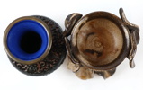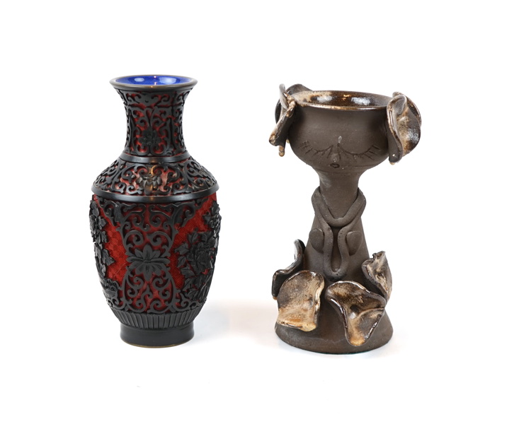 Vas och skål på fot, cloisonne och keramik, bl.a Ajmo Design, Danmark.