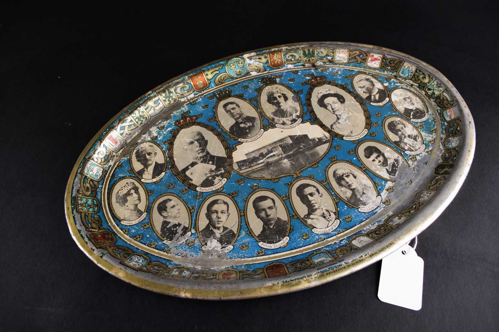 Bilder PLÅTBRICKA äldre med kungamotiv. 34x22cm. (bruksslitage)