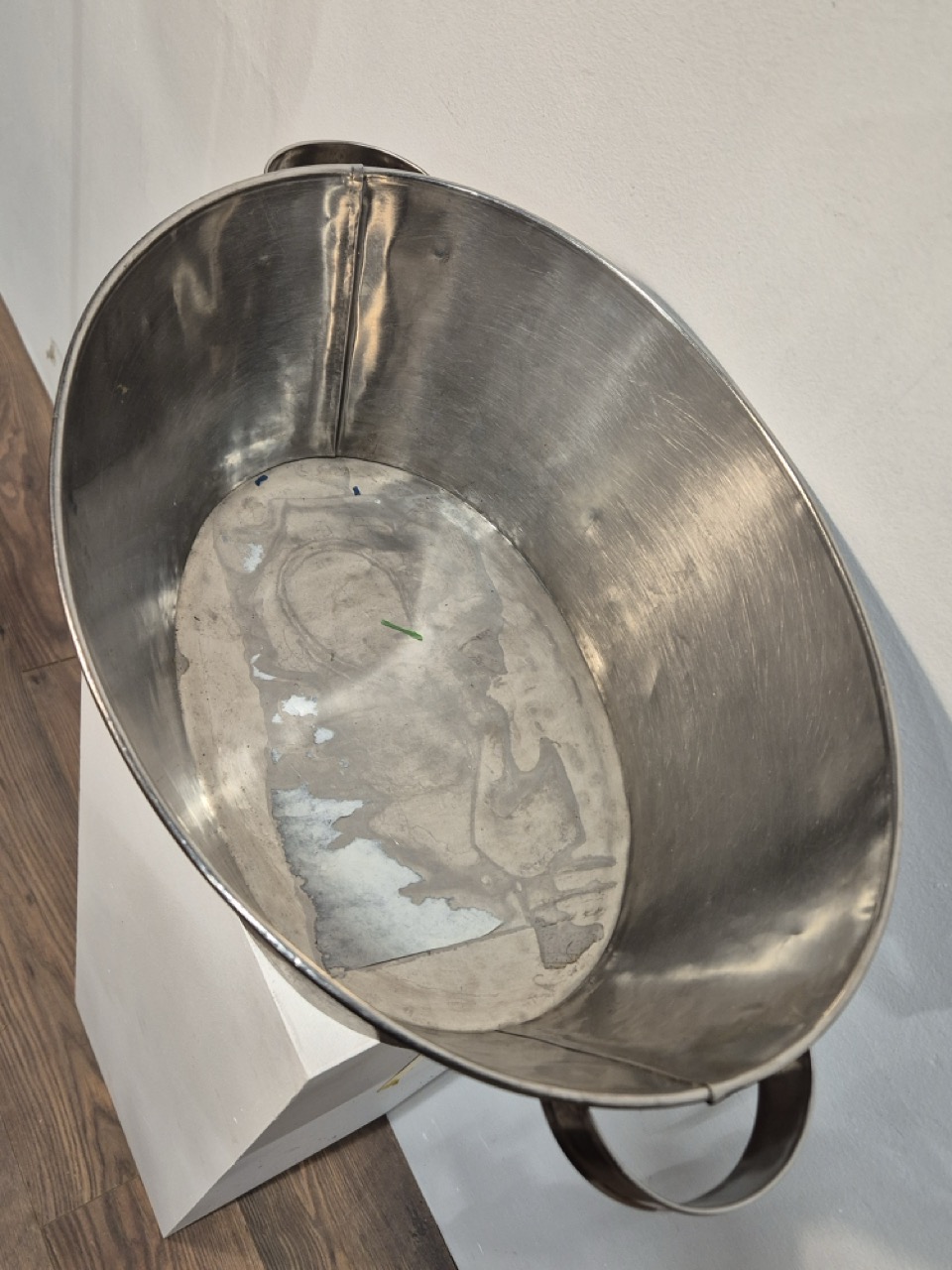 Rostfri balja med handtag . lite bulor. Mått utan handtag 44x33.5cm H.17cm