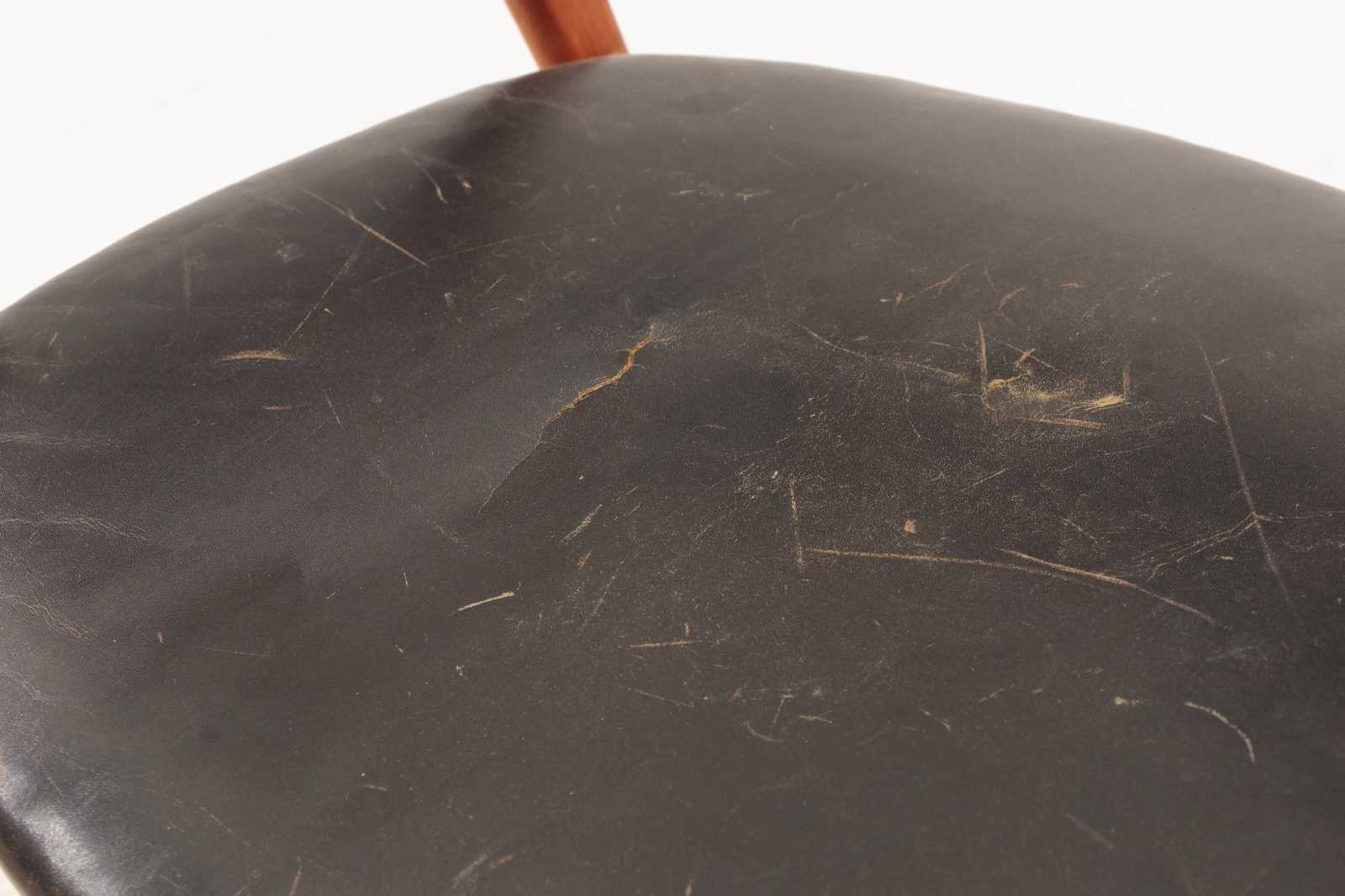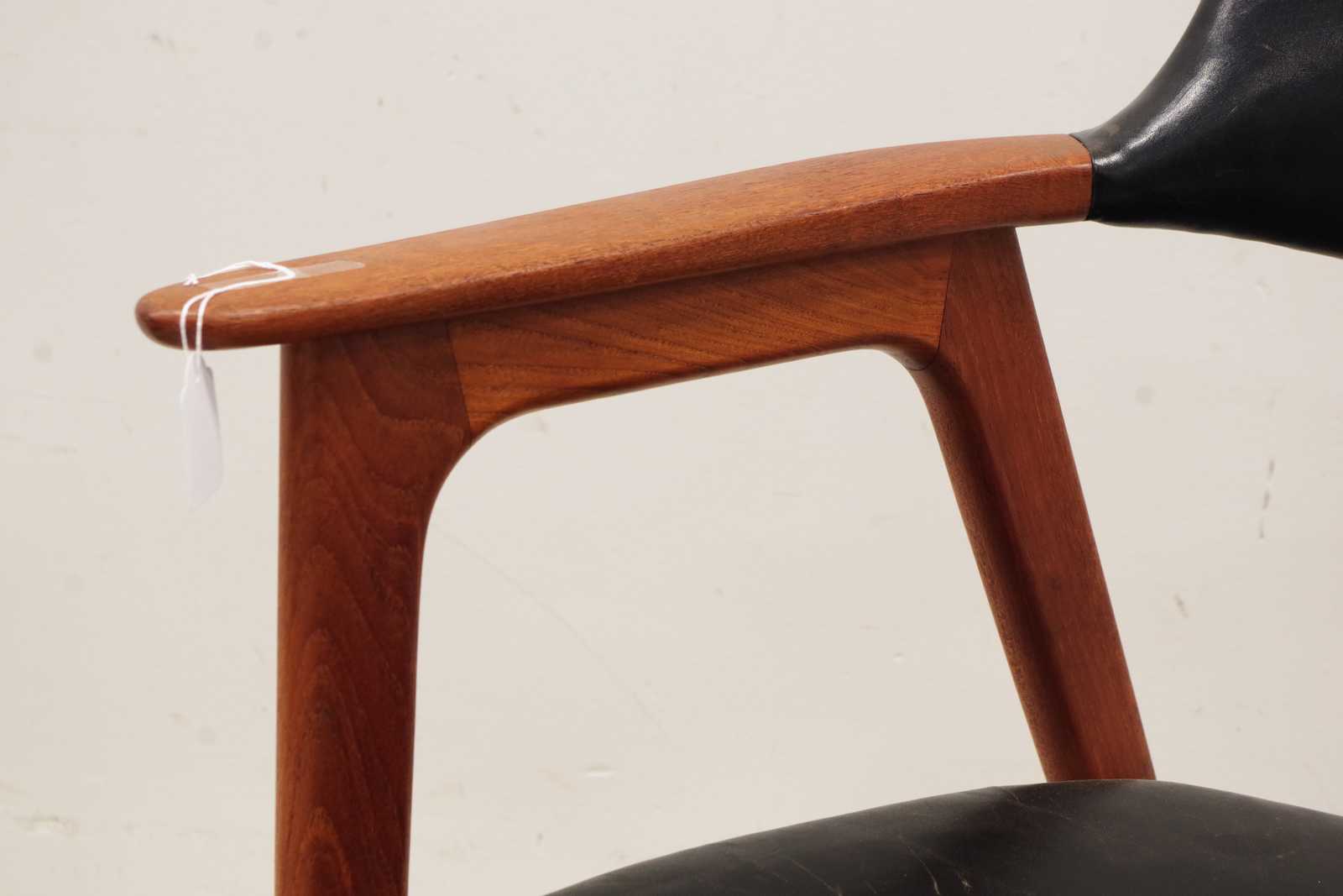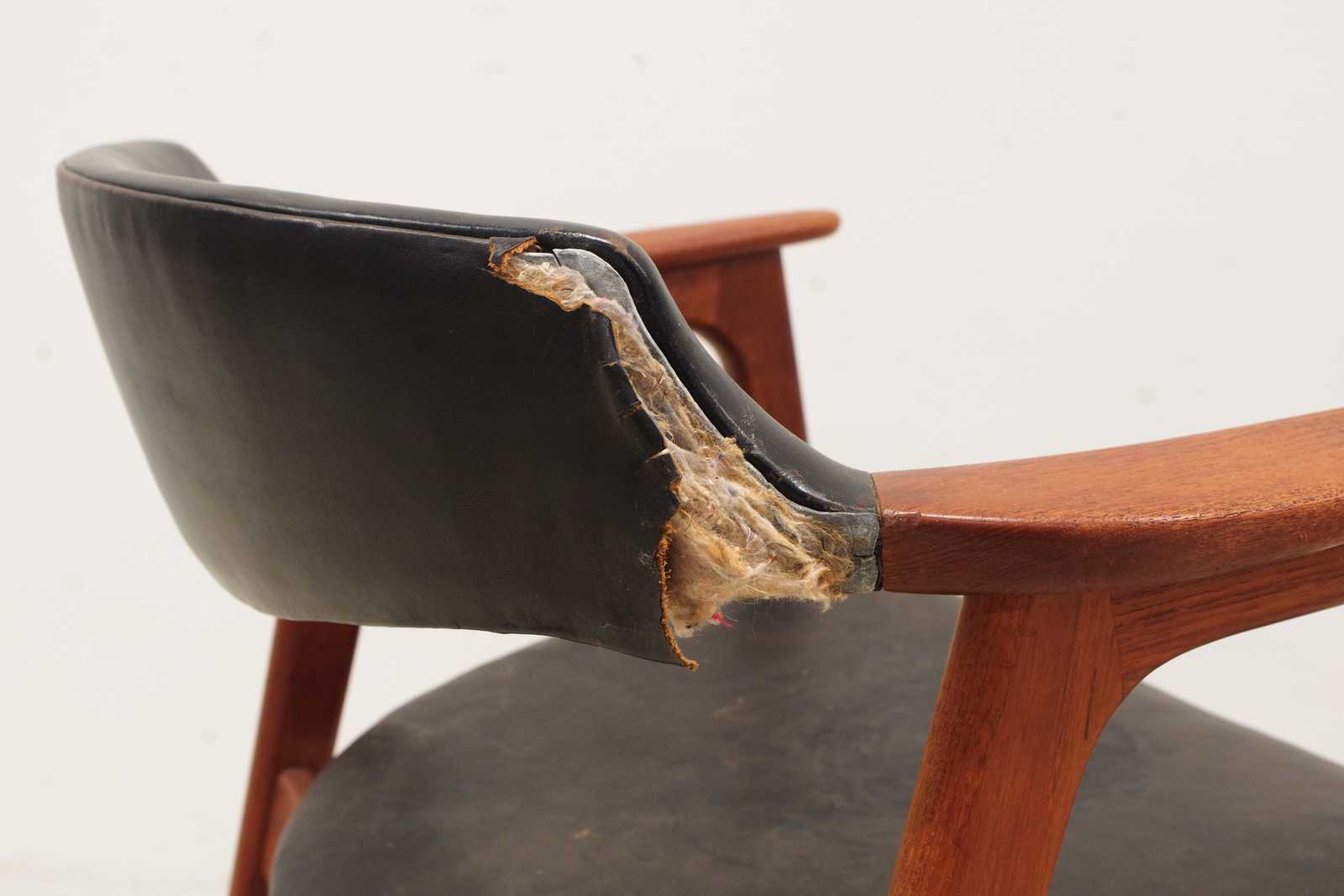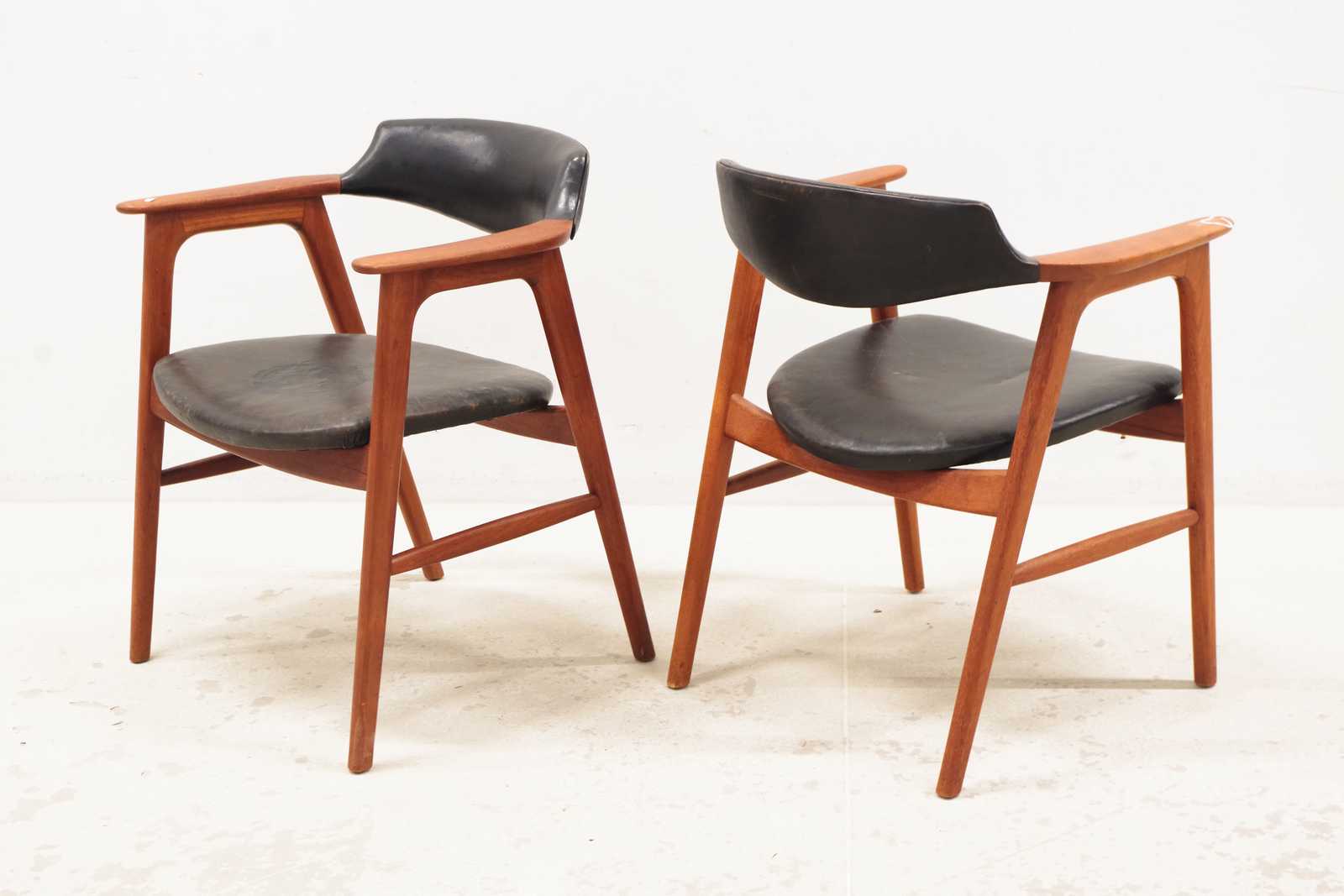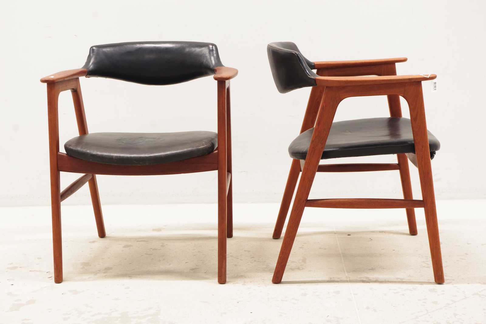 Bilder KARMSTOLAR Paret, Erik Kirkegaard, Danmark, stomme i teak, klädda i skinn, 1900 talets mitt. (skador på klädsel, en sittdyna lös, skruv saknas)