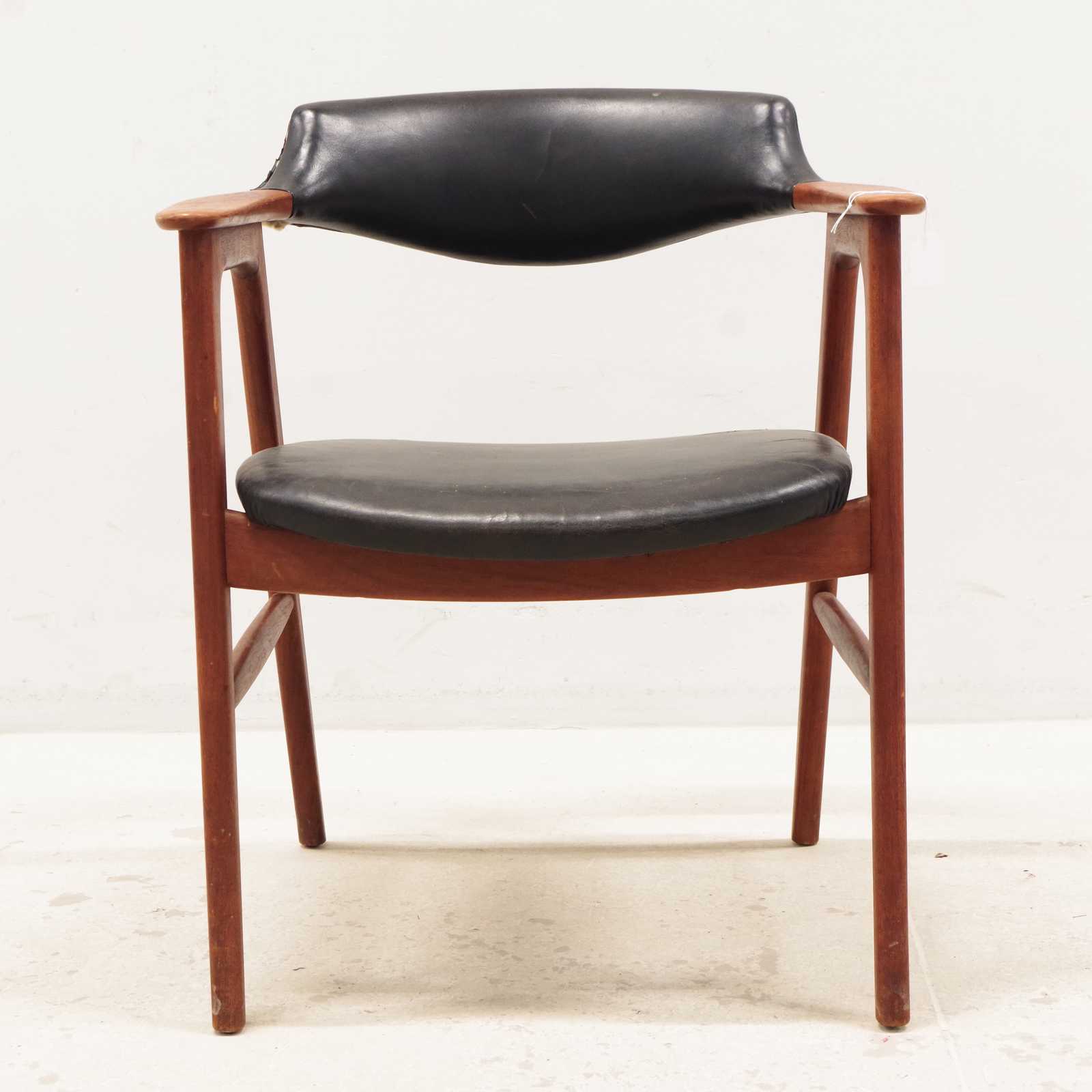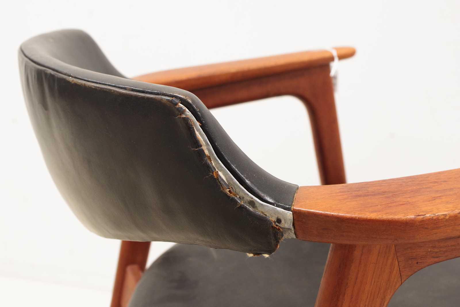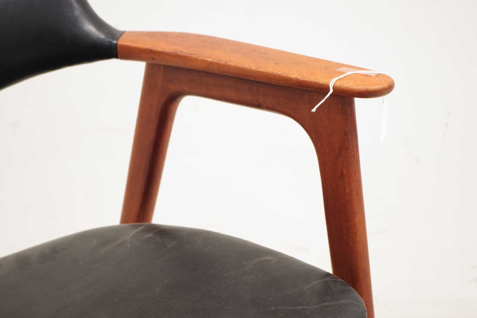 Auktioner KARMSTOL Erik Kirkegaard, Danmark, stomme i teak, klädd i skinn, 1900 talets mitt. (skador på klädsel förekommer, skada i stommen, se extrabild)