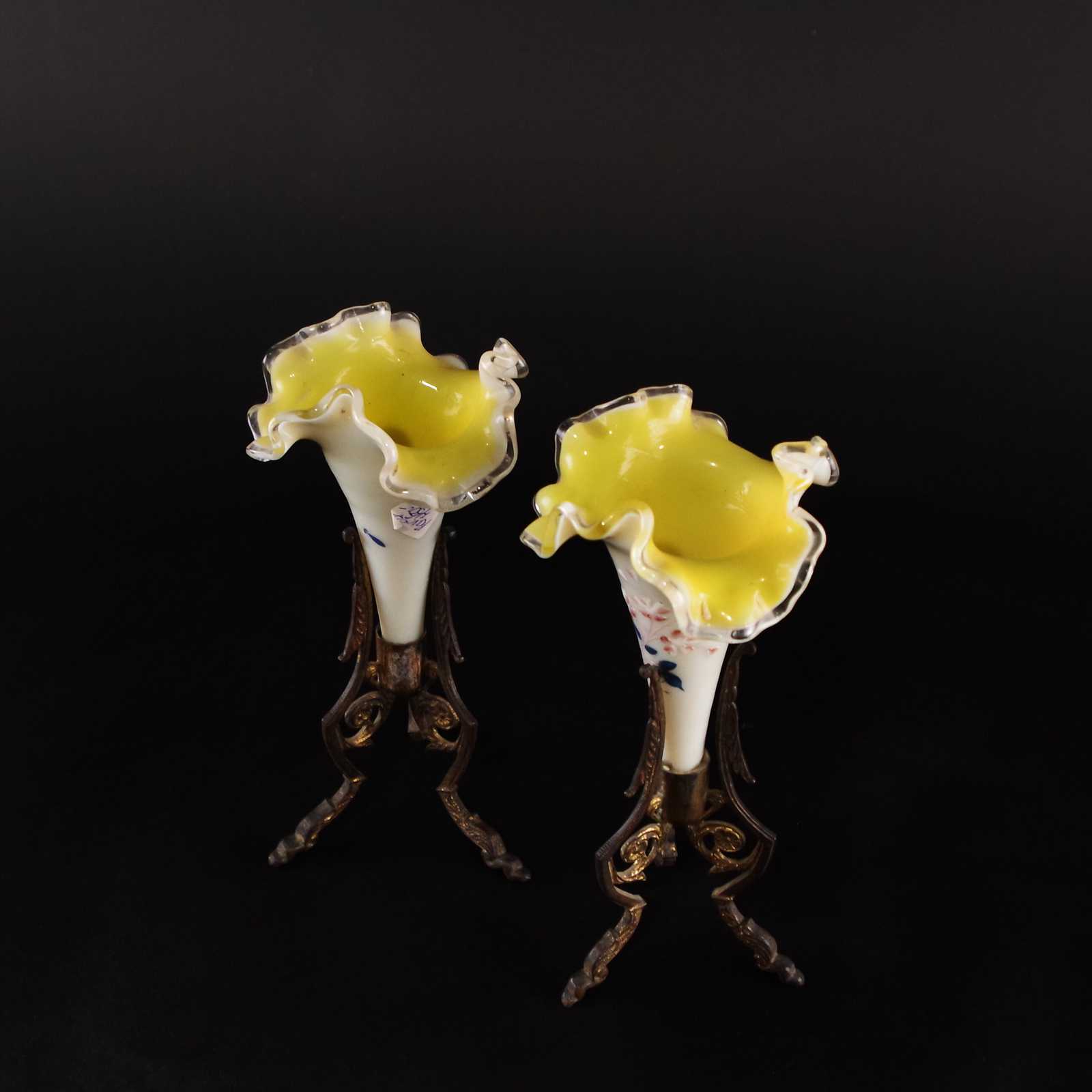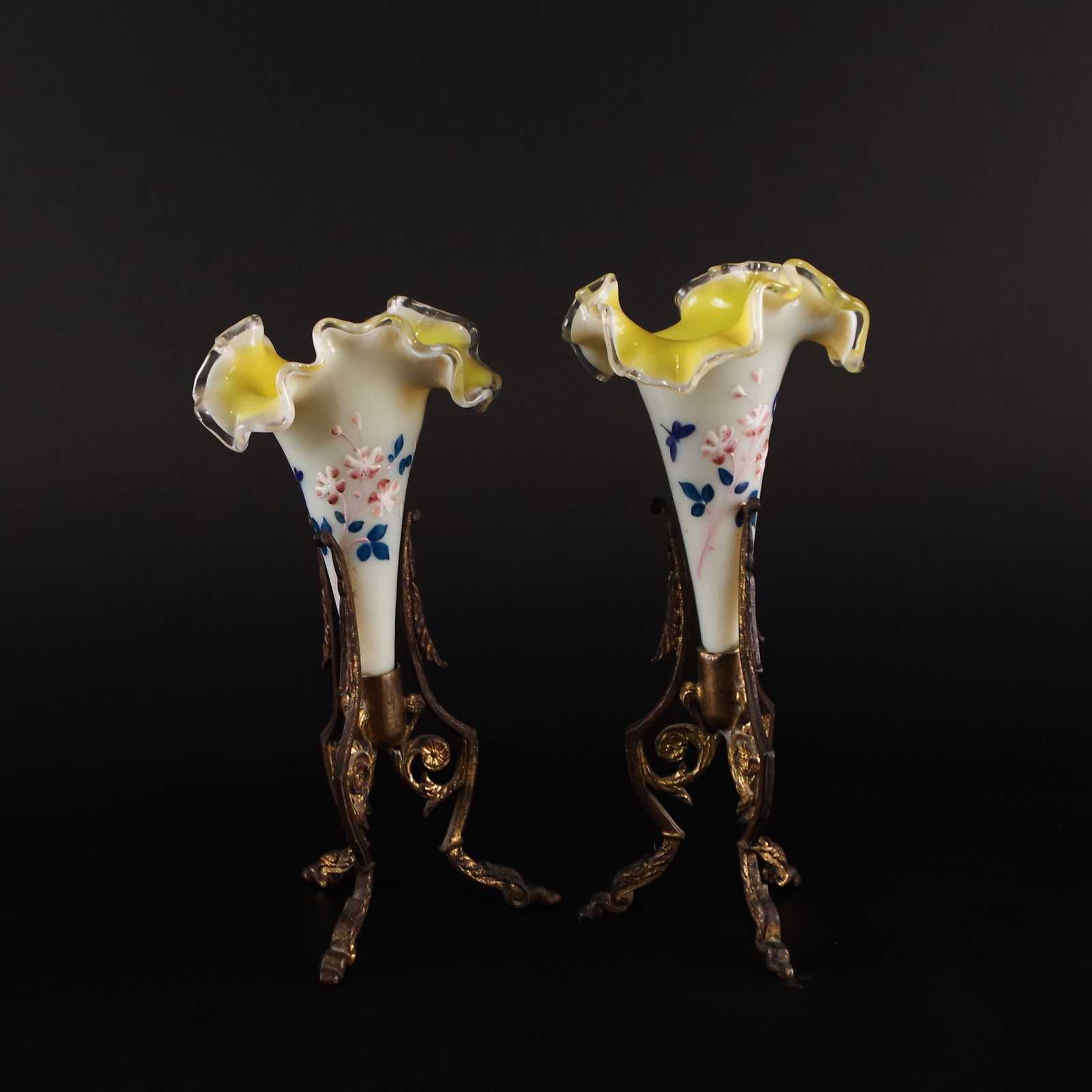 Bilder VASER 2st tidigt 1900 tal glas/metall, handmålade. H: ca 19cm.