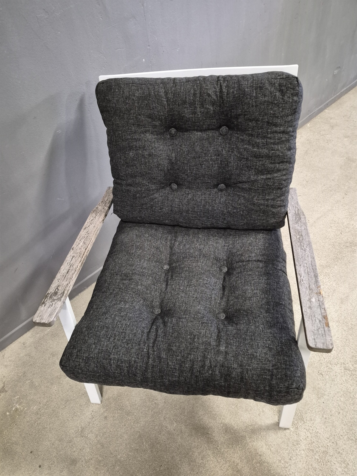Fåtölj metall/trä med dynor, höjd 96 cm karmar väderbitna