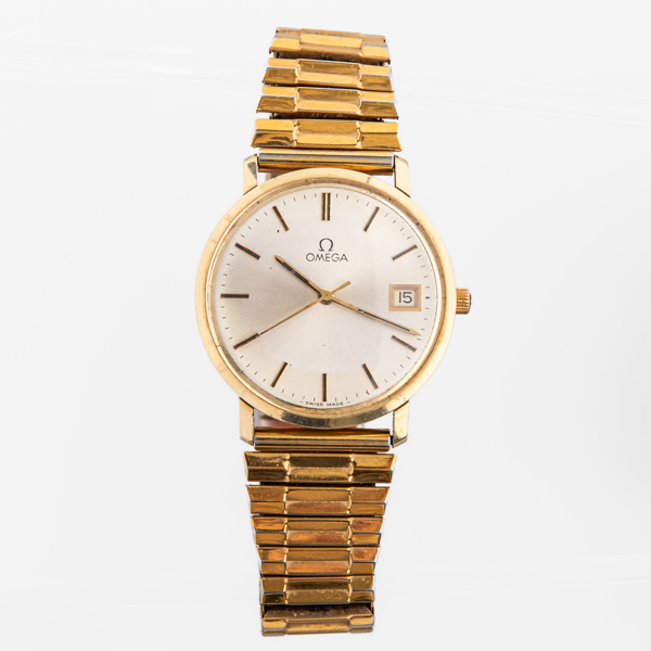 OMEGA, herrarmbandsur, 14K guld, manuell, med datum, 1900-talets senare del.