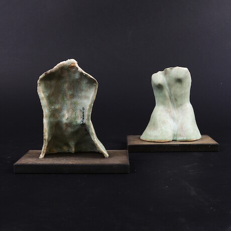 Auktioner Keramik & Porslin Nicklas Andreasson, skulpturer 2 st, 35/85, 2001, glaserat stengods, monterade på träplattor, höjd 17-18 cm