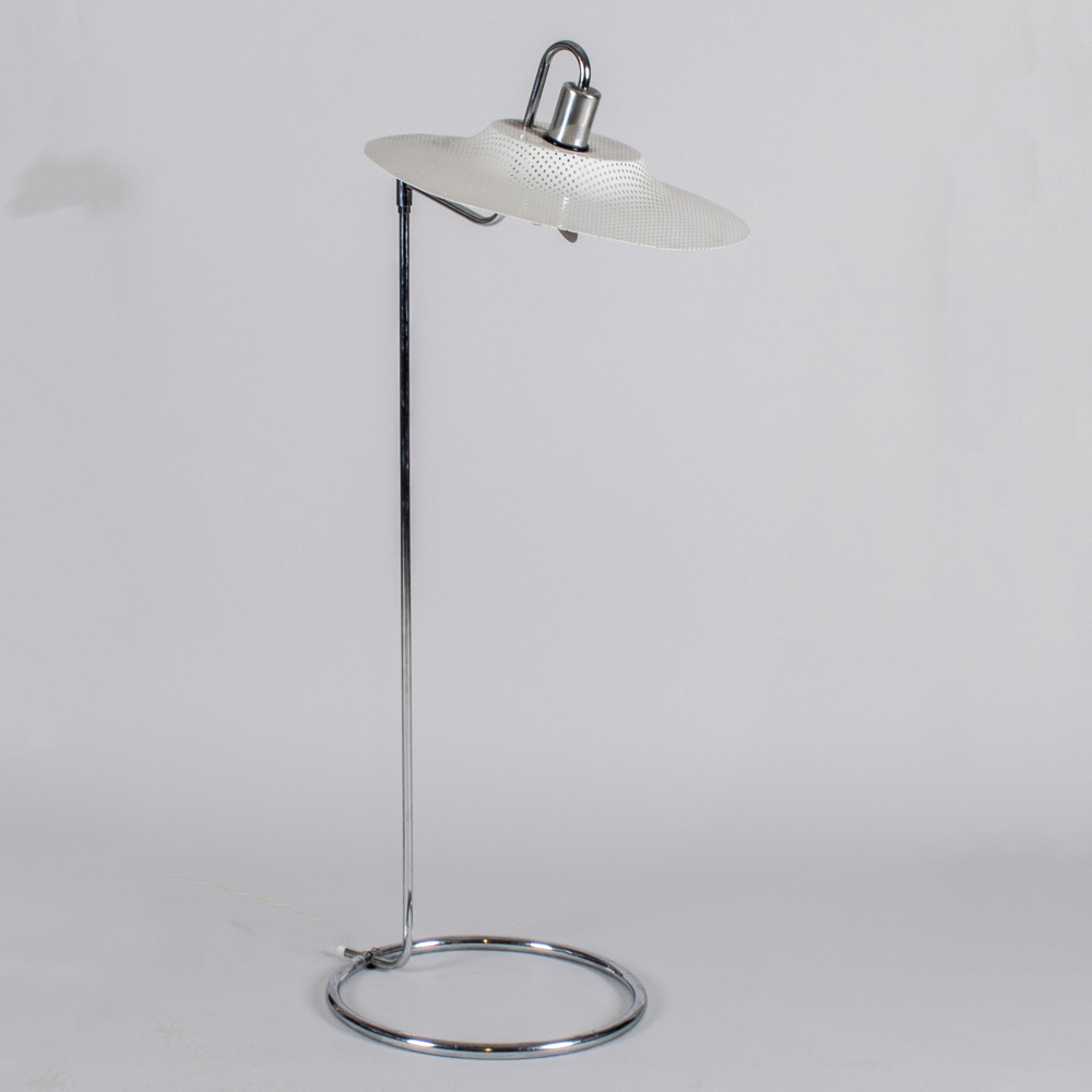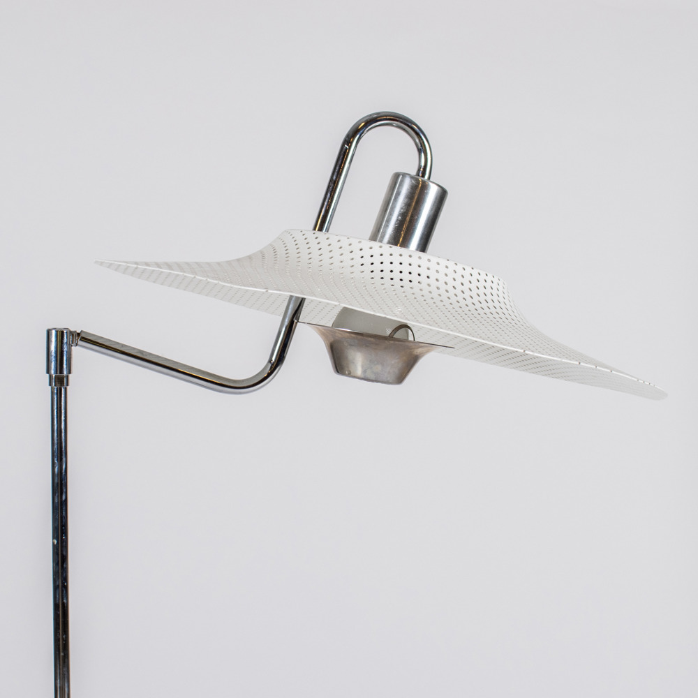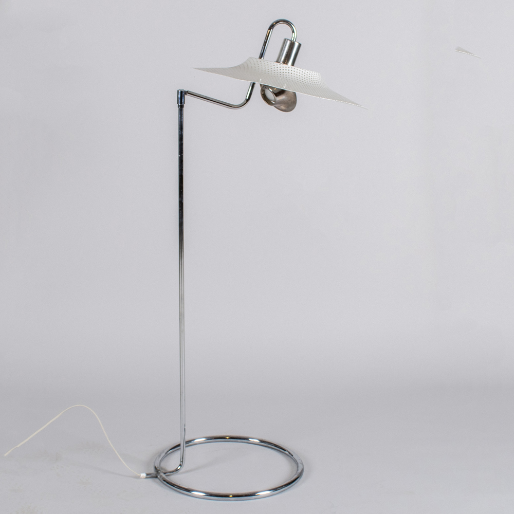 Kromat stål med vitlackerad, perforerad skärm, etikettmärkt, höjd ca 115 cm