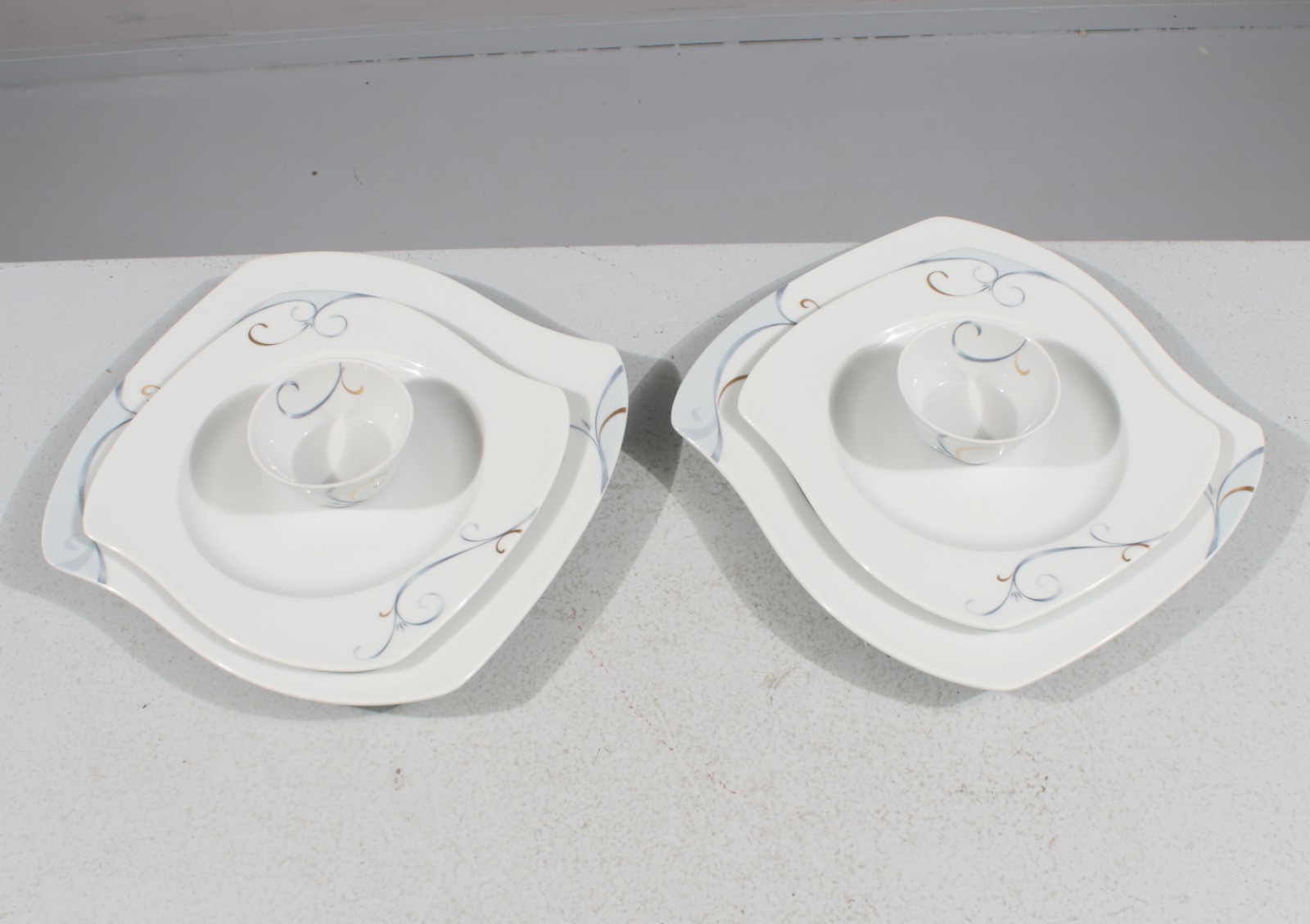 6 delar, 2st mattallrikar 26x27,5 cm, 2st förrättstallrikar 20,5x22,5 cm samt 2st små skålar. (vån3)