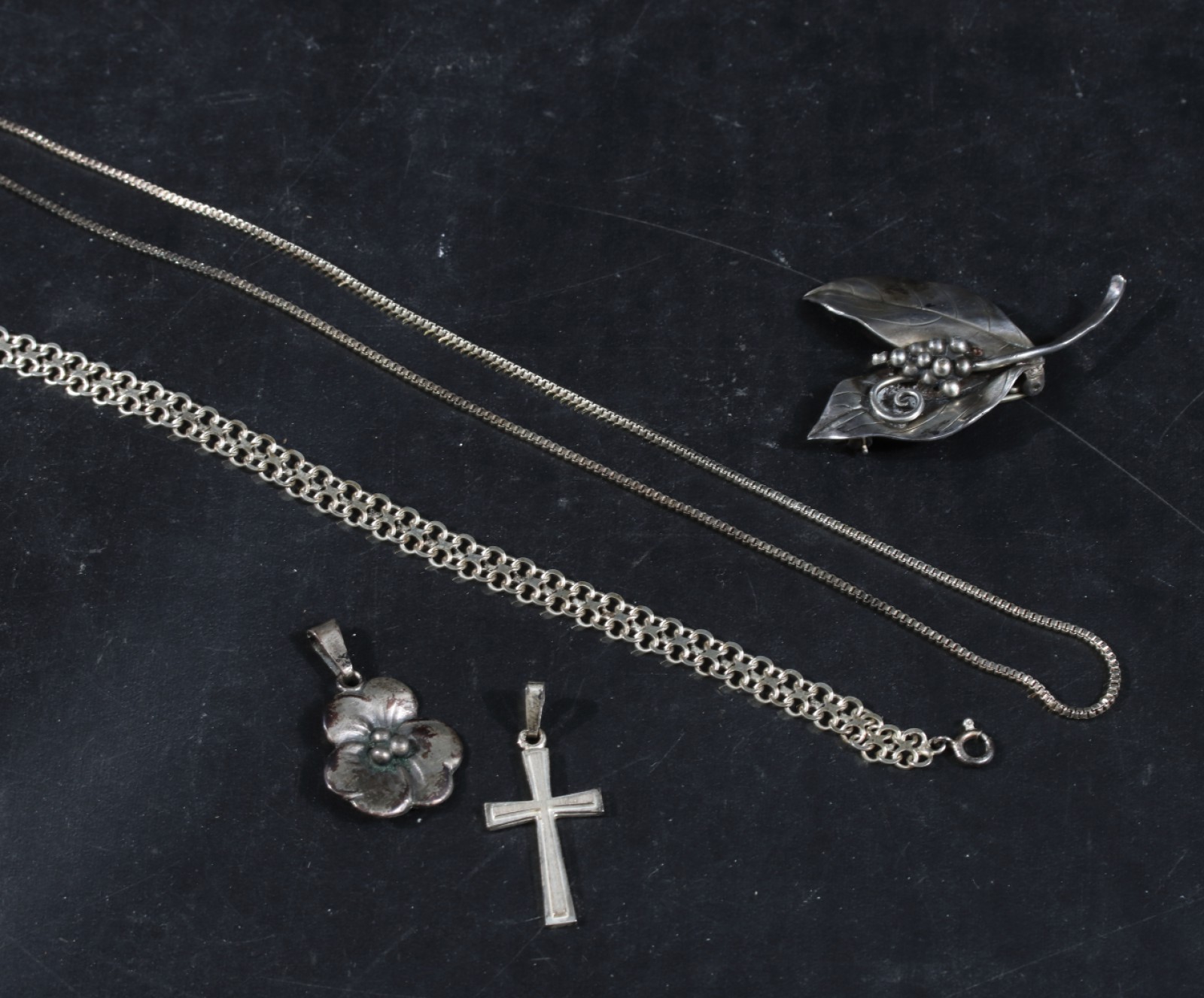 5 delar, kontrollerat silver, 1st armband X-länk längd 18 cm, 1st halsband längd 44 cm, 2st hängen samt 1st brosch, vikt 21,7 gram. (vån3)