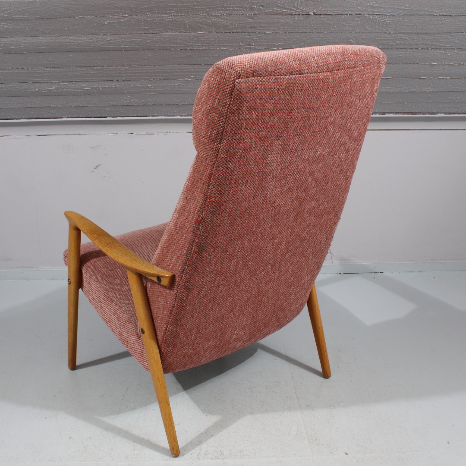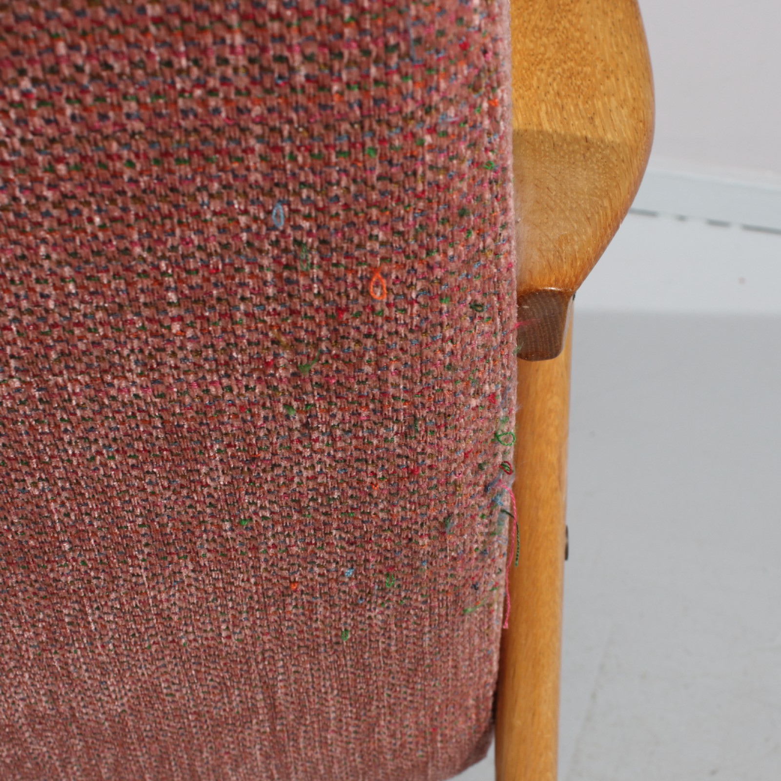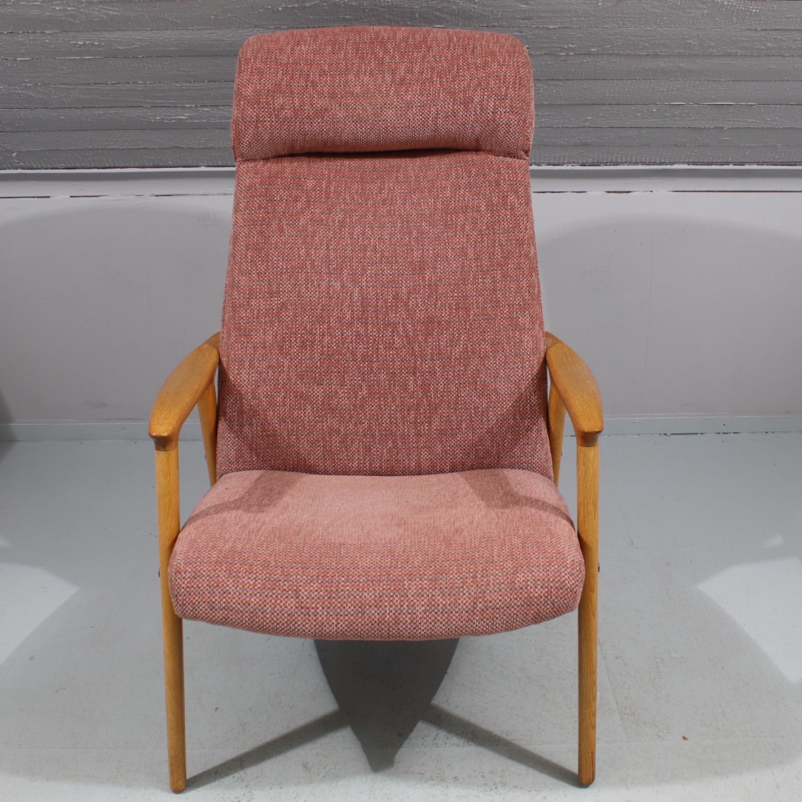 Stomme i ljus ek, tygklädsel, ur Triva serien, Nordiska Kompaniet, 1950,60-tal, senare klädsel, märkning saknas, Rh.101, B.66, Sh.40 cm. (vån3)