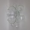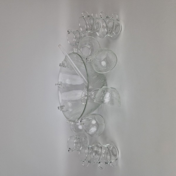 Bålset. Skål och 8 koppar i glas. Slev och krokar i plast.
