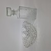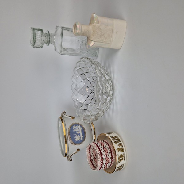 Skål och karaff, glasYtterfoder, porslinFlaskformad vas, porslin, delvis glaserad, Susanne Öhlén för Rörstrand, stämpelsigneradAskfat, porslinLjuskopp glas och pärlor