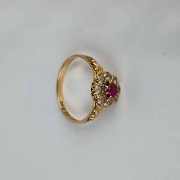 Ring, 18K guld, med en röd och 8 vita stenar, Joh Petterssons Eftr Juvelerar AB, Stockholm, 1951