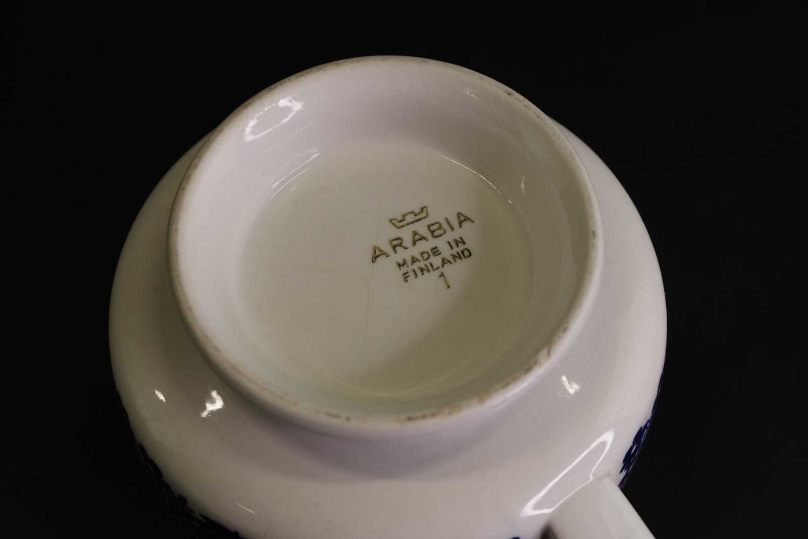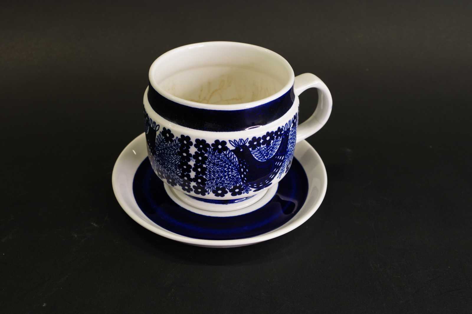Auktioner TEKOPPAR Arabia "Sinilintu" Raija Uosikkinen Kopp H:9,5 cm D:10,5 cm (koppar krackelerade och missfärgade, två även sprickor i grepe)