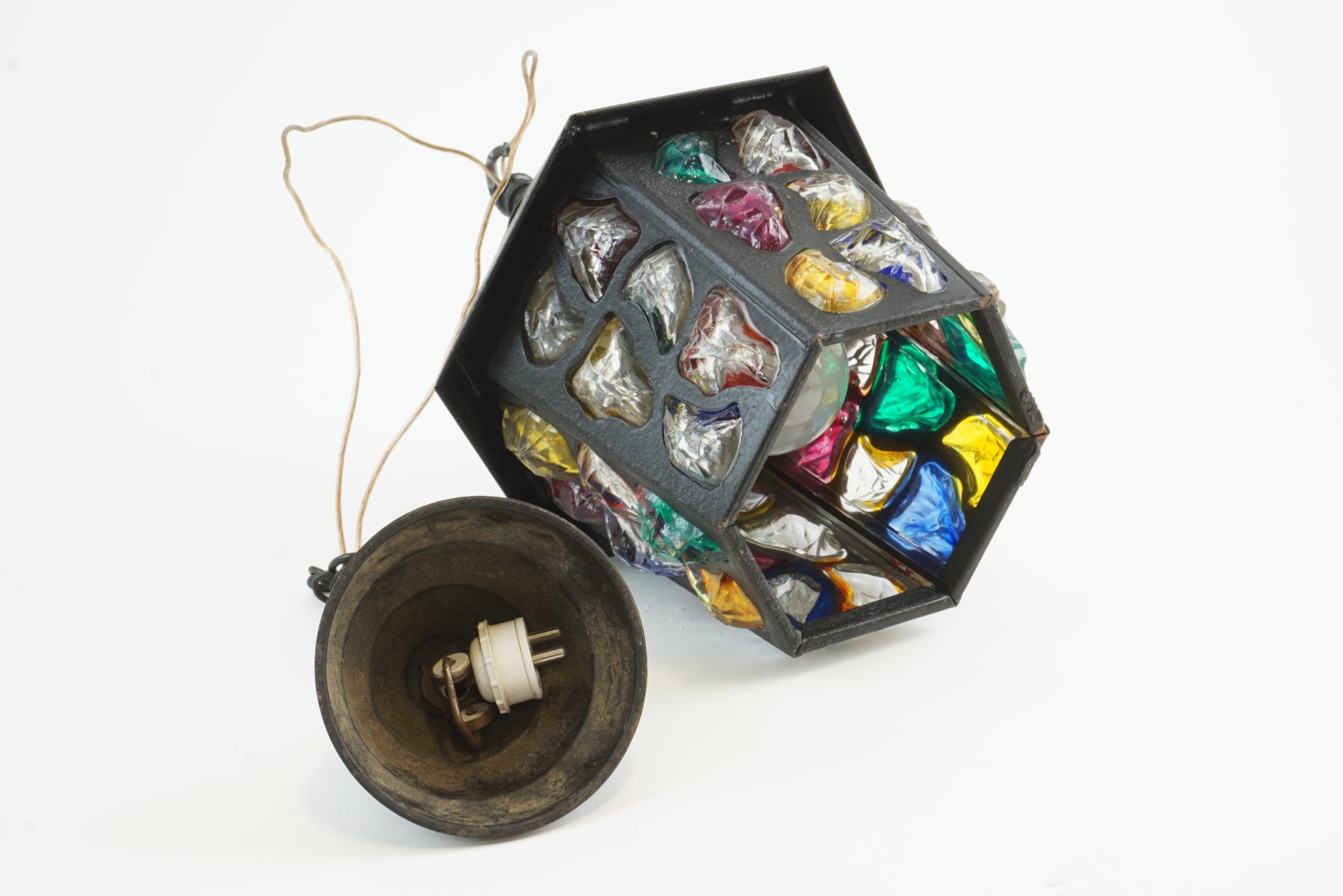 Bilder Taklampa i metall och färgat glas.