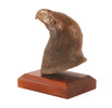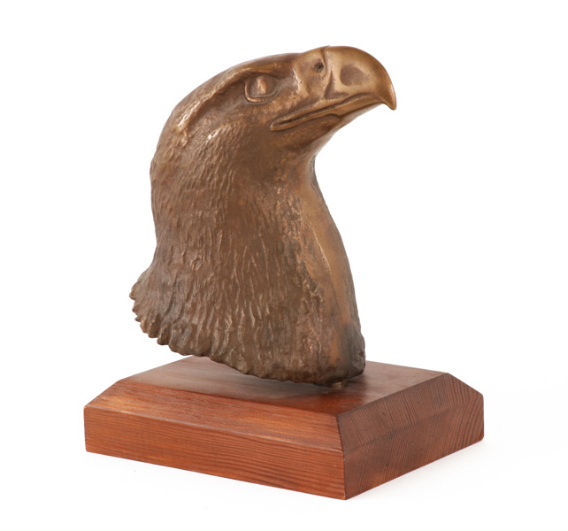 Skulptur i brons, örnhuvud. Signerad och numrerad 13/75. Daterad 1988. Sockel av furu.