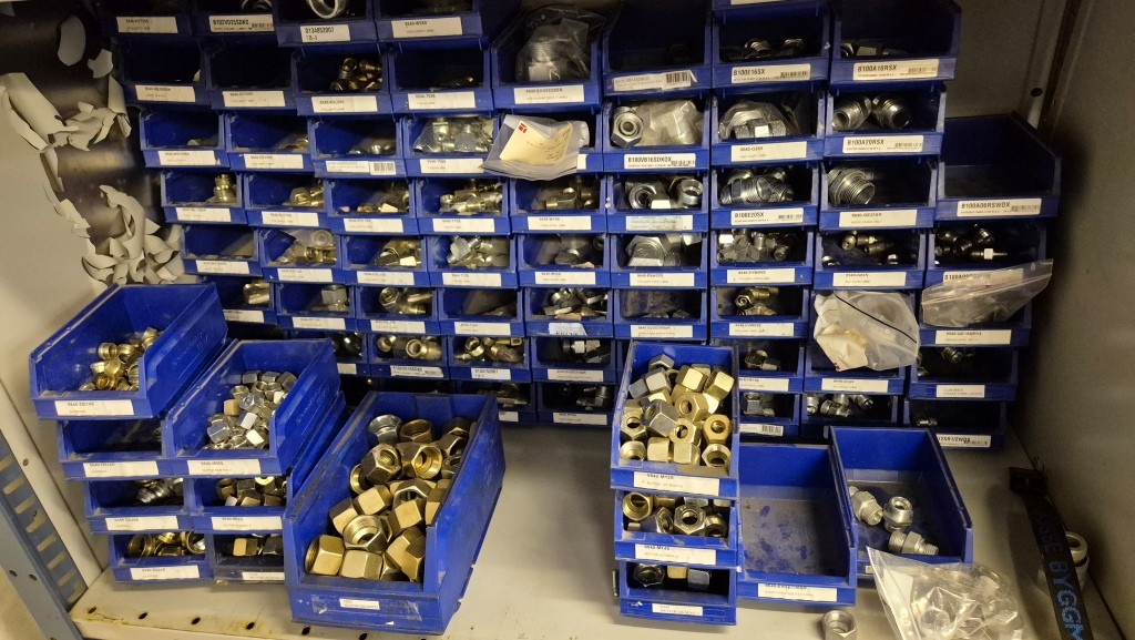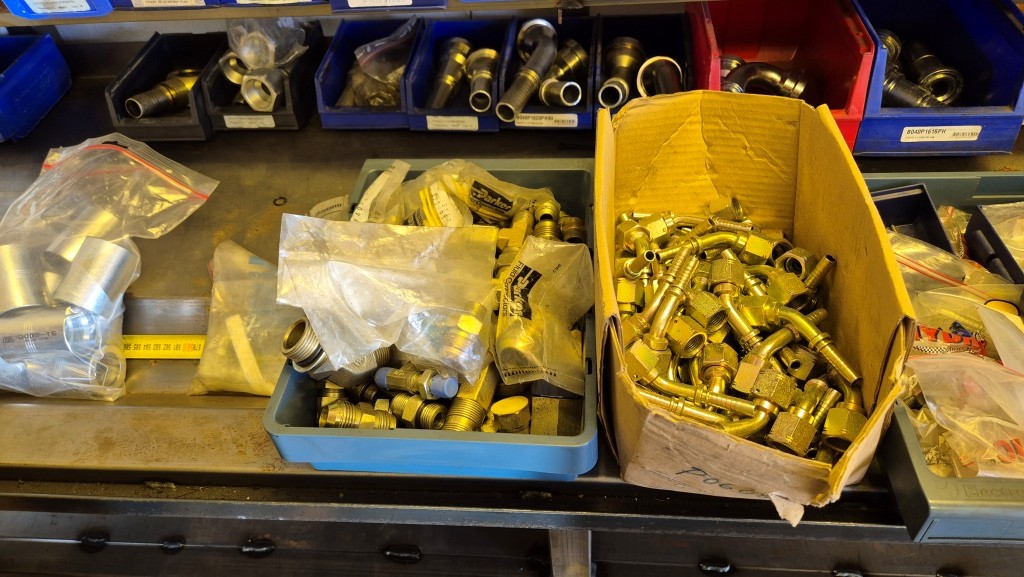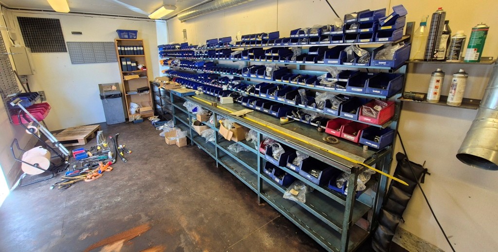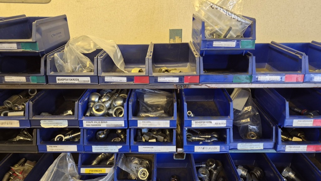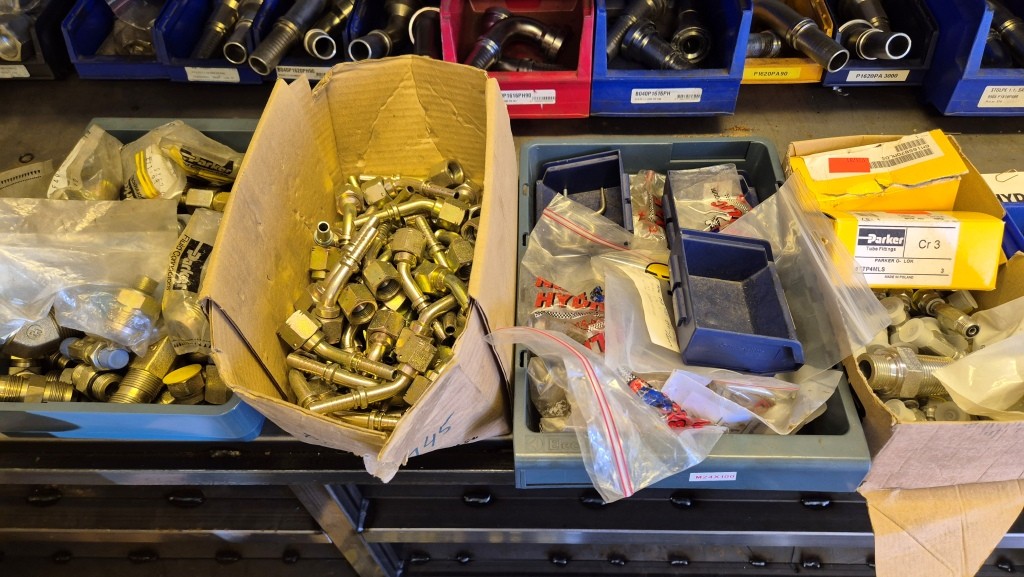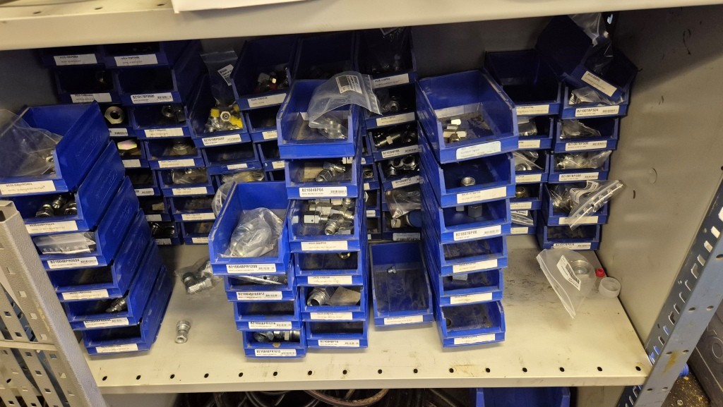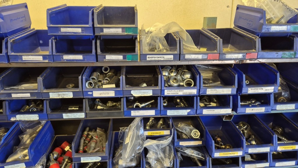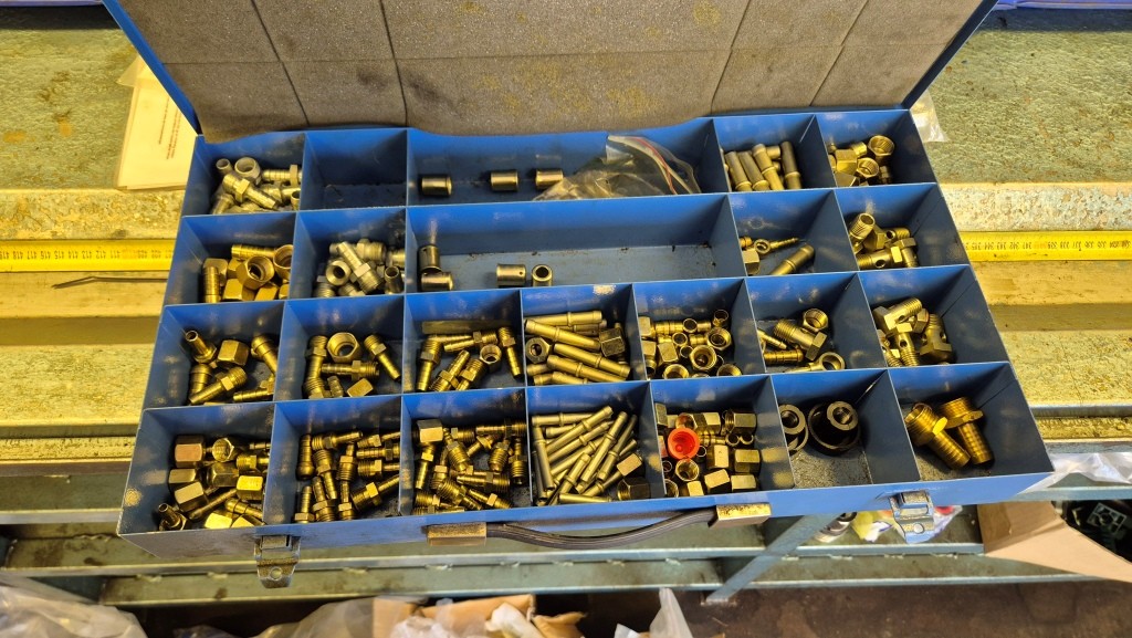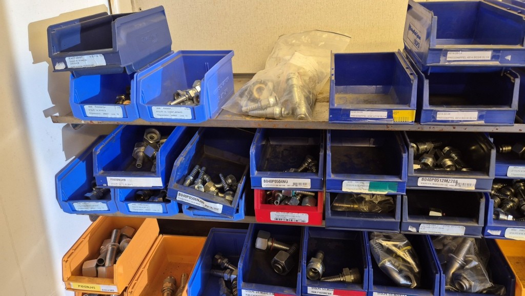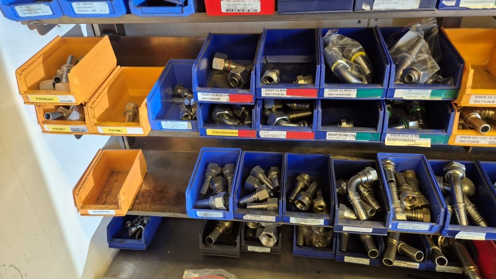 Slangverkstad med kopplingar, slang, detaljer för tillverkning av hydraulslang, slangbänk, lagerhyllor, plockbacklådor.Maskiner för slangtillverkning finns ej. Inventering för detaljerna finns ej. Inklusive plåtskylt "Slangverkstad"Längd på bänk: 575cm