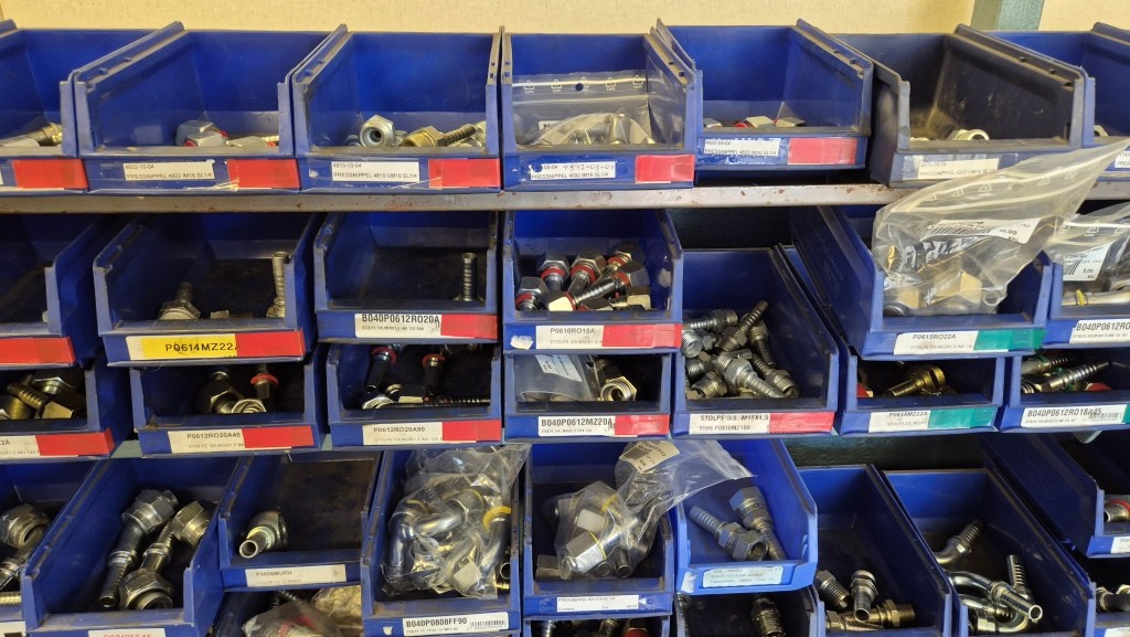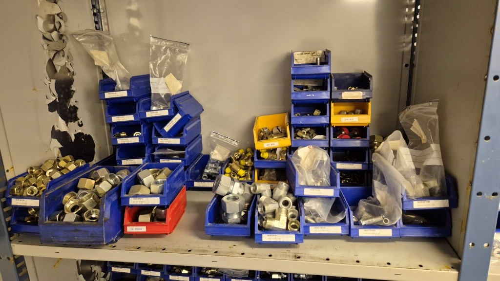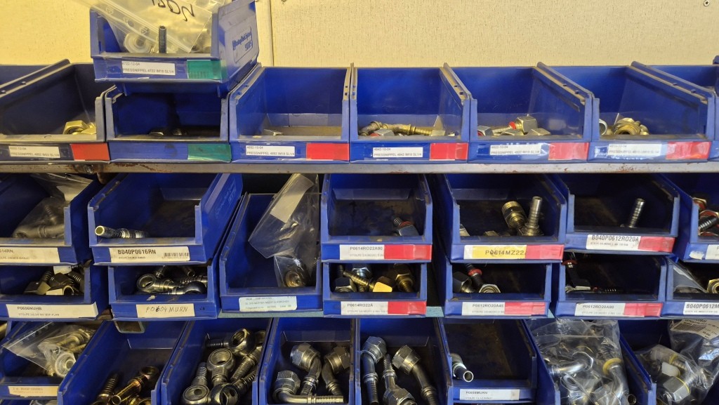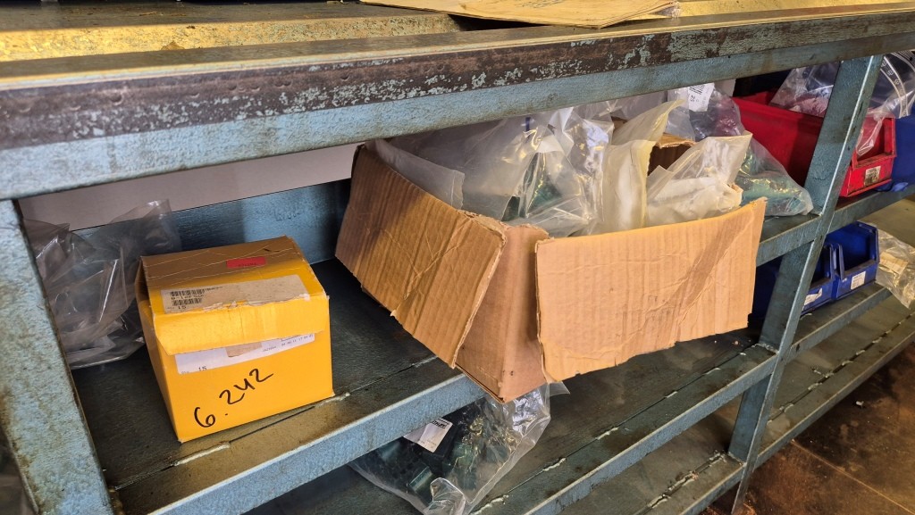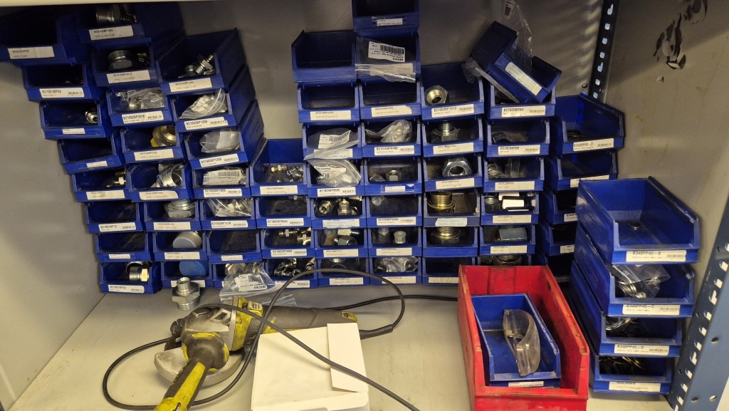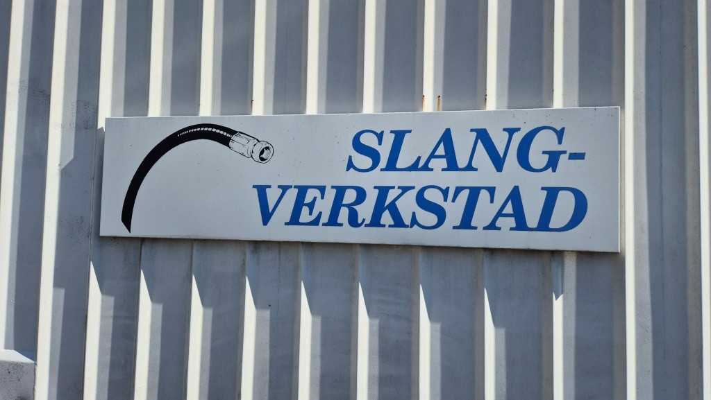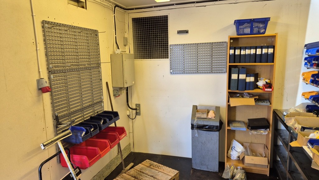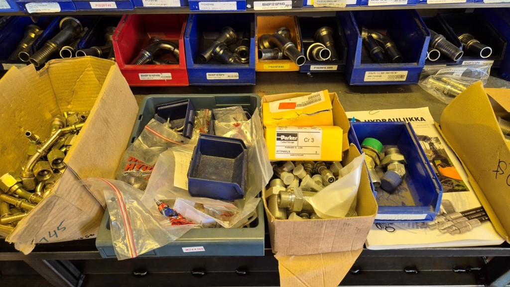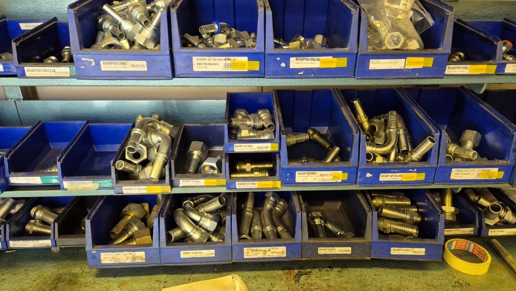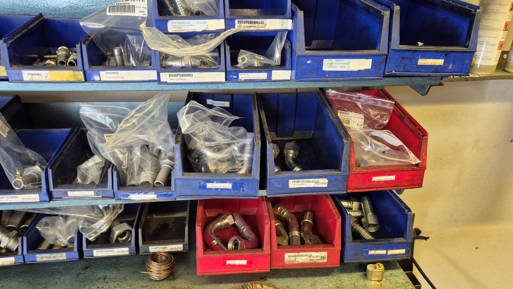 Slangverkstad med kopplingar, slang, detaljer för tillverkning av hydraulslang, slangbänk, lagerhyllor, plockbacklådor.Maskiner för slangtillverkning finns ej. Inventering för detaljerna finns ej. Inklusive plåtskylt "Slangverkstad"Längd på bänk: 575cm