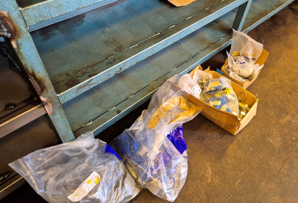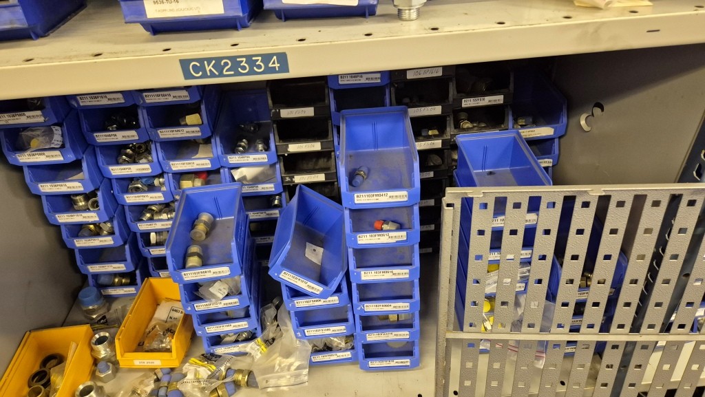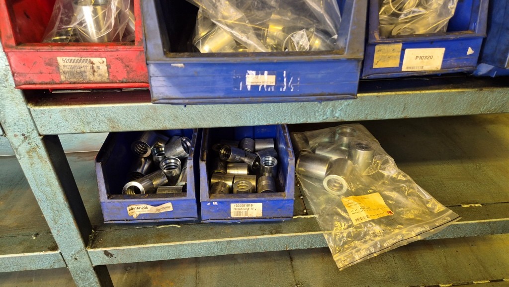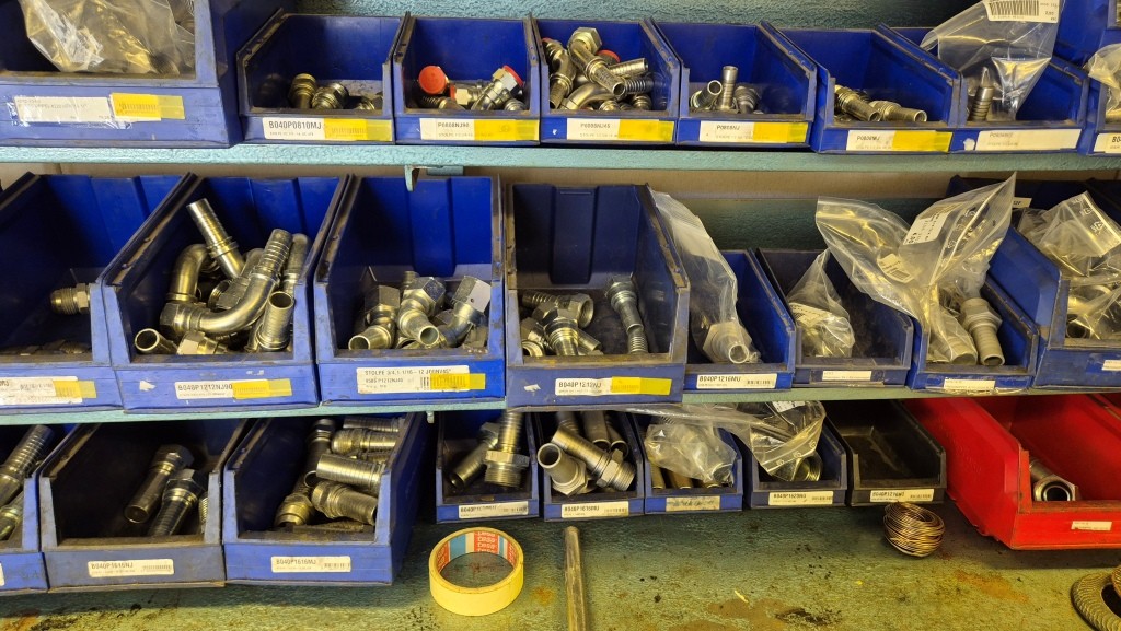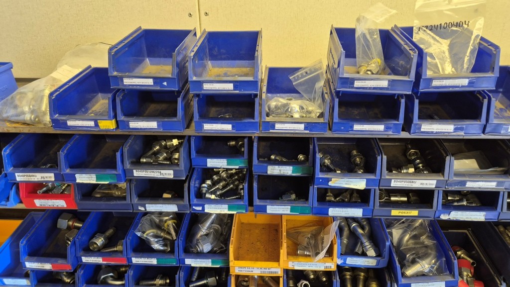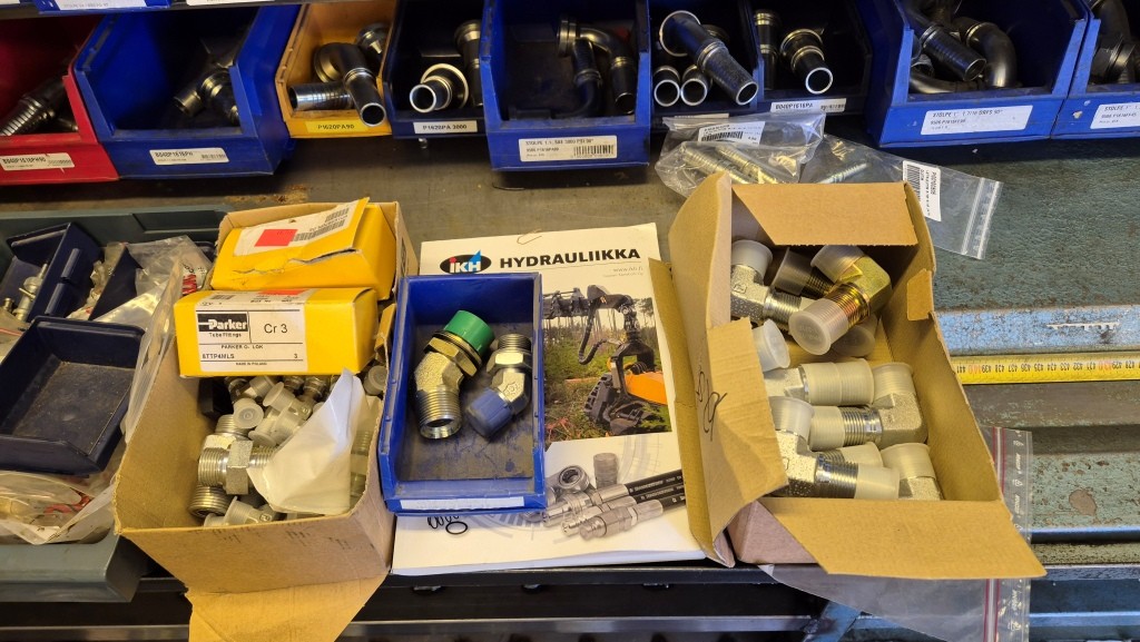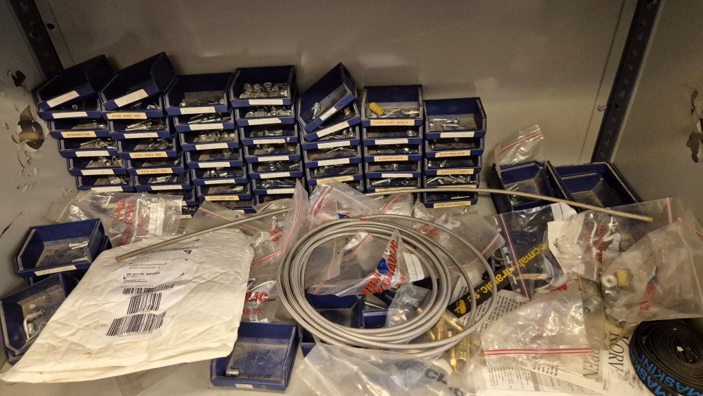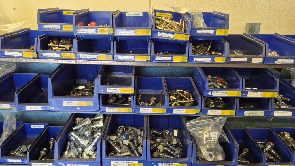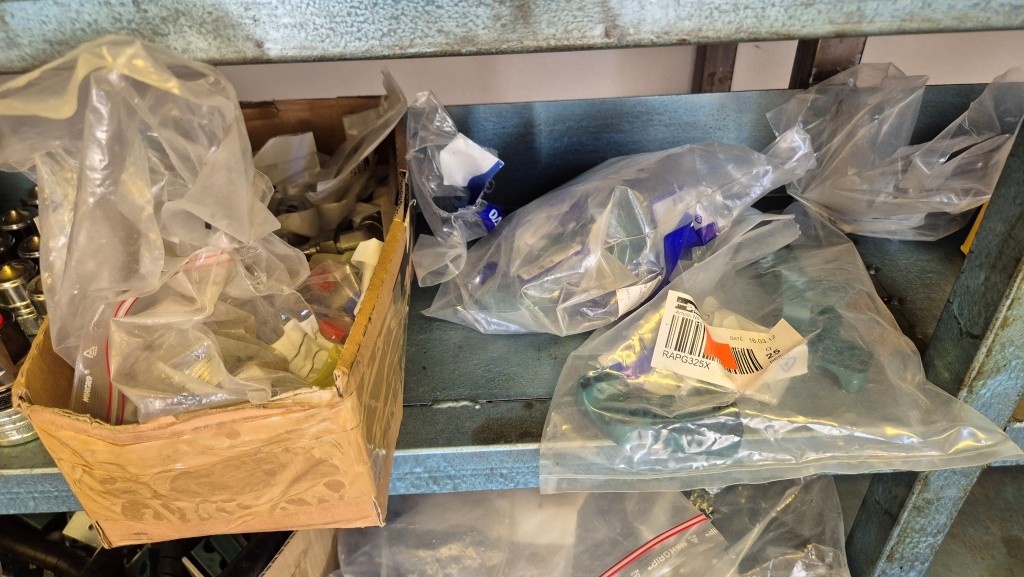 Slangverkstad med kopplingar, slang, detaljer för tillverkning av hydraulslang, slangbänk, lagerhyllor, plockbacklådor.Maskiner för slangtillverkning finns ej. Inventering för detaljerna finns ej. Inklusive plåtskylt "Slangverkstad"Längd på bänk: 575cm