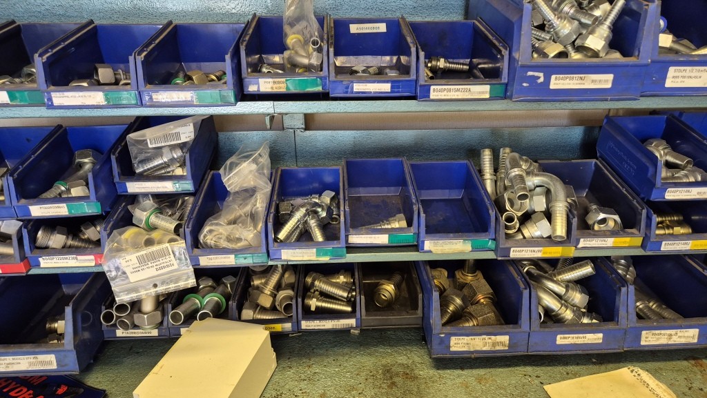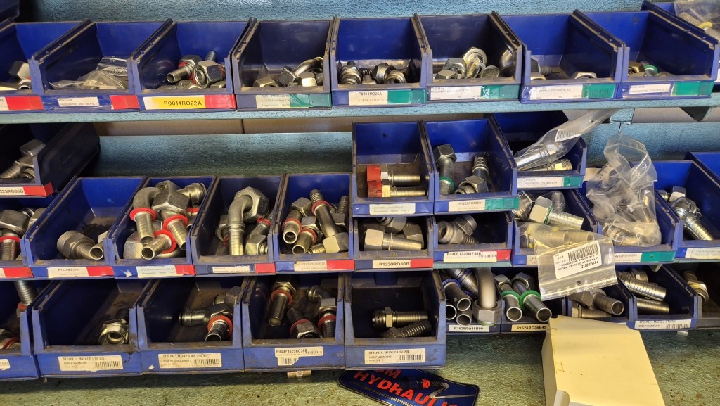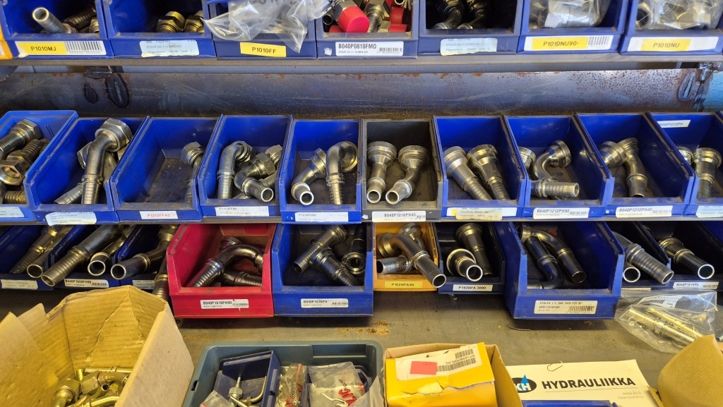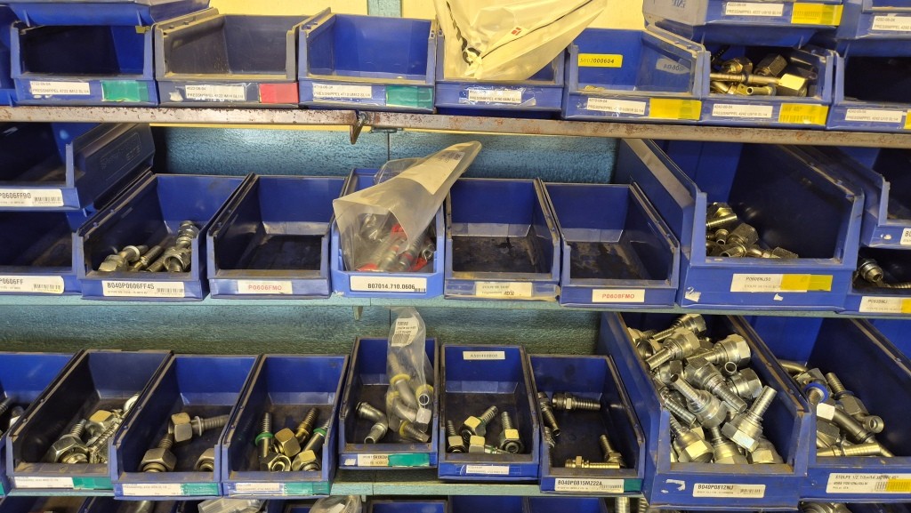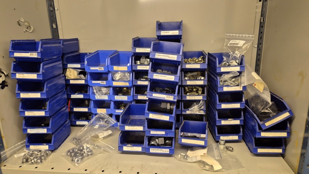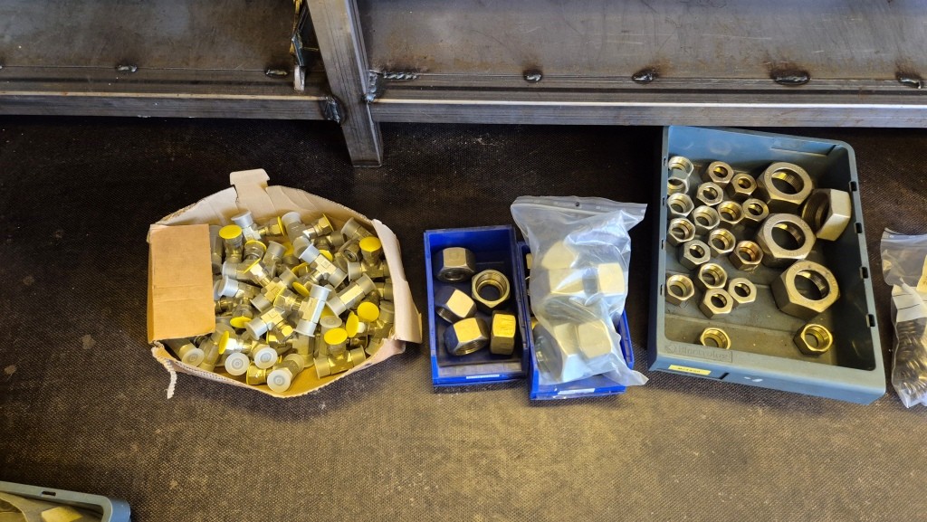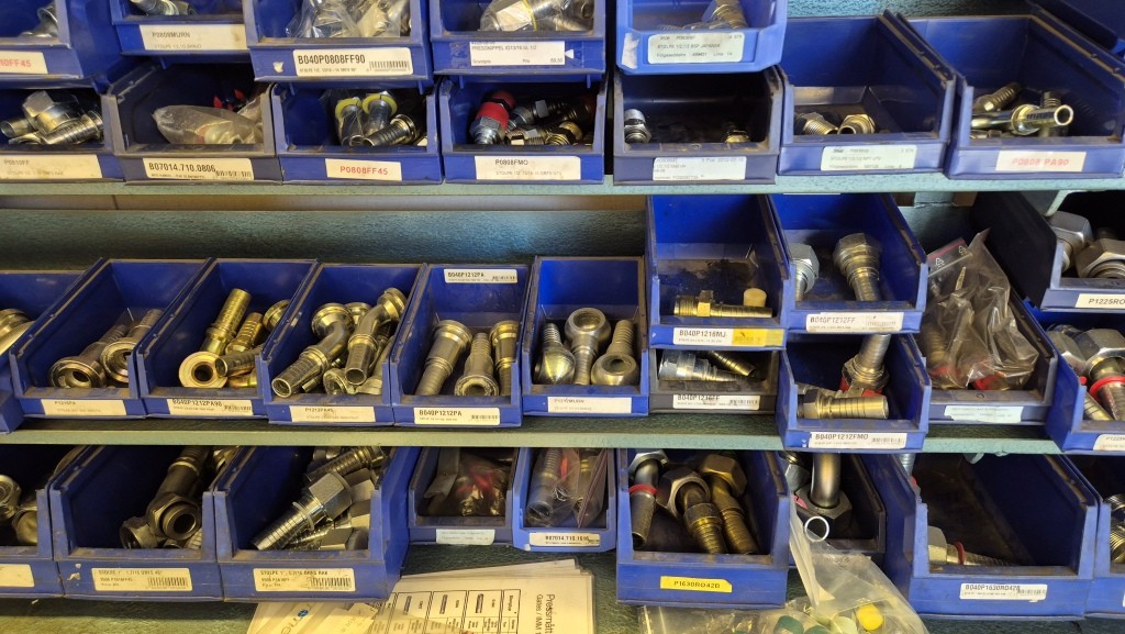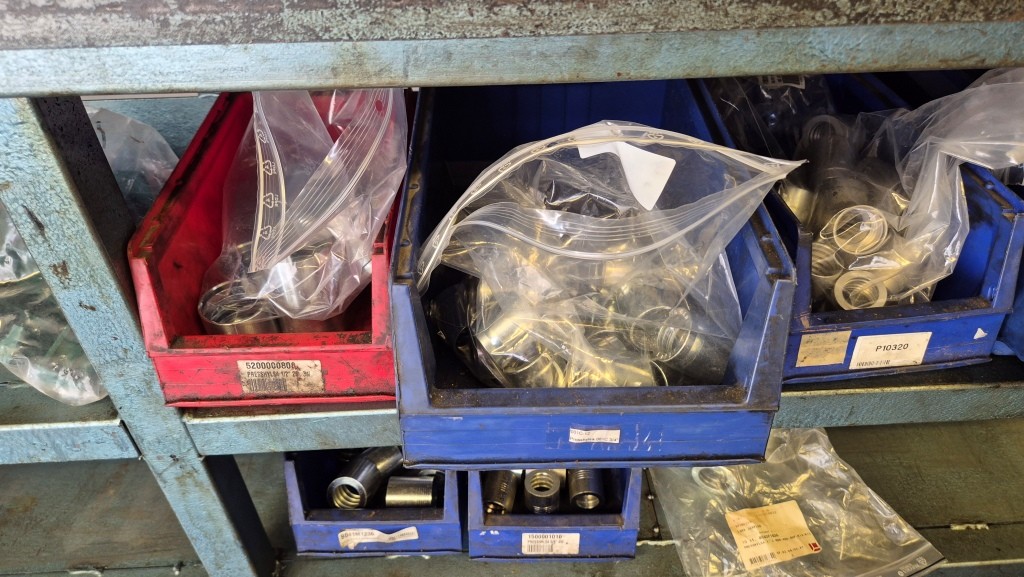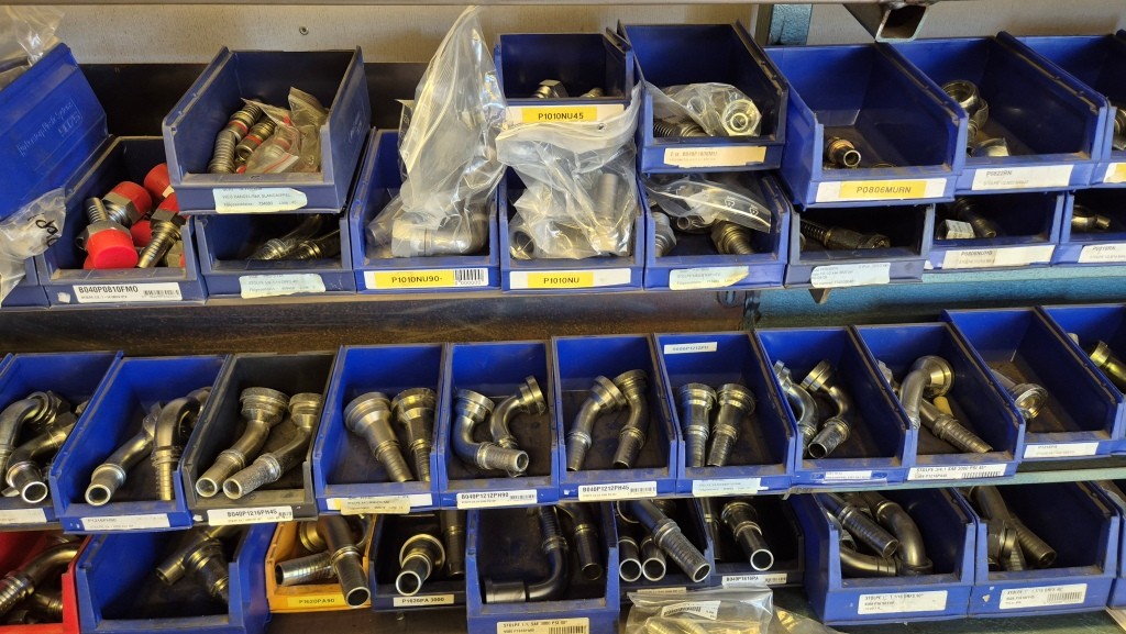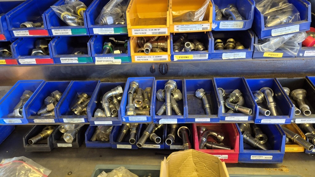 Slangverkstad med kopplingar, slang, detaljer för tillverkning av hydraulslang, slangbänk, lagerhyllor, plockbacklådor.Maskiner för slangtillverkning finns ej. Inventering för detaljerna finns ej. Inklusive plåtskylt "Slangverkstad"Längd på bänk: 575cm