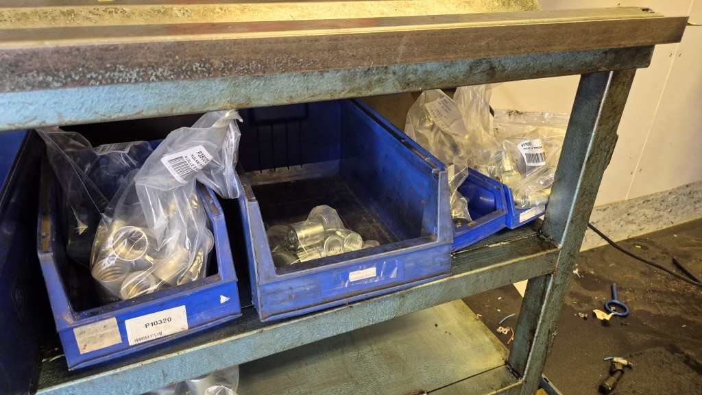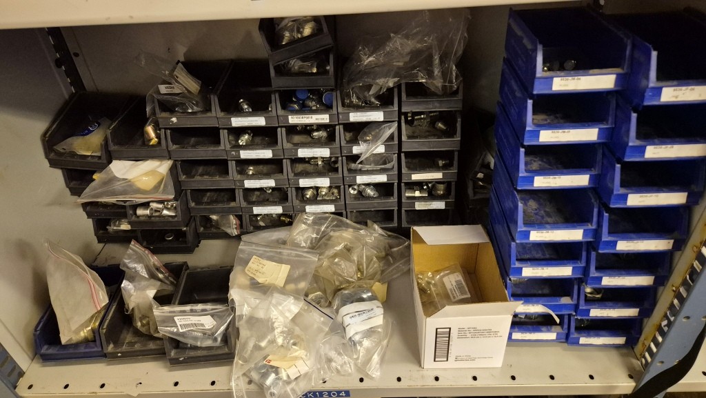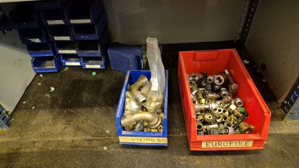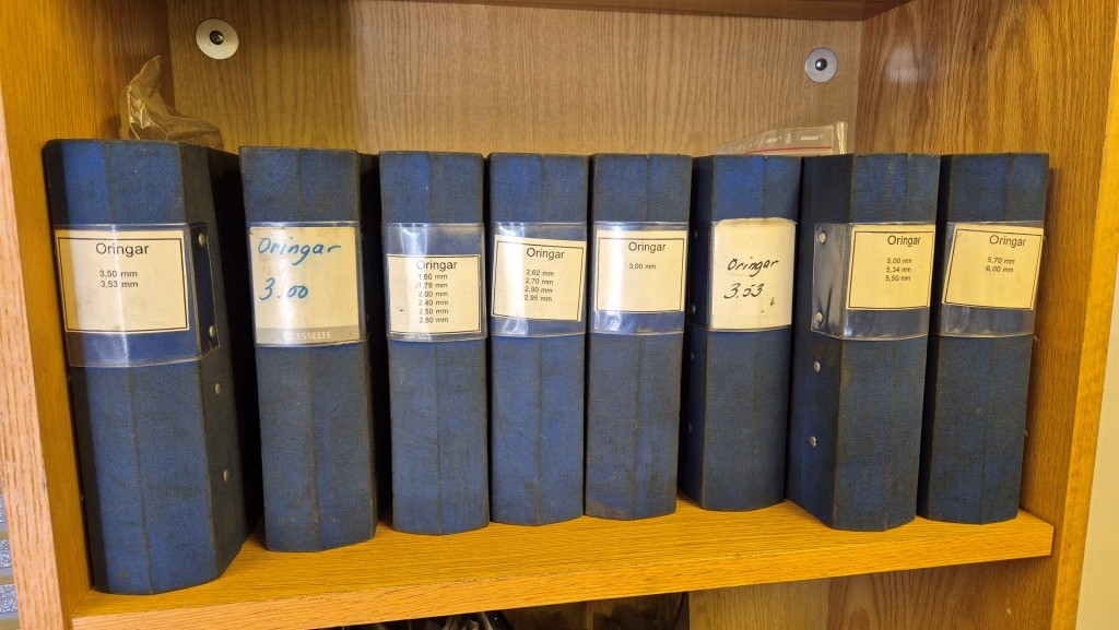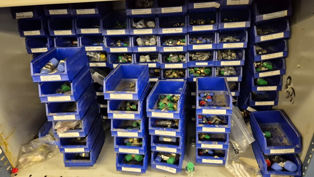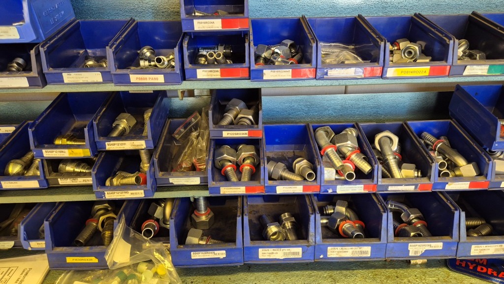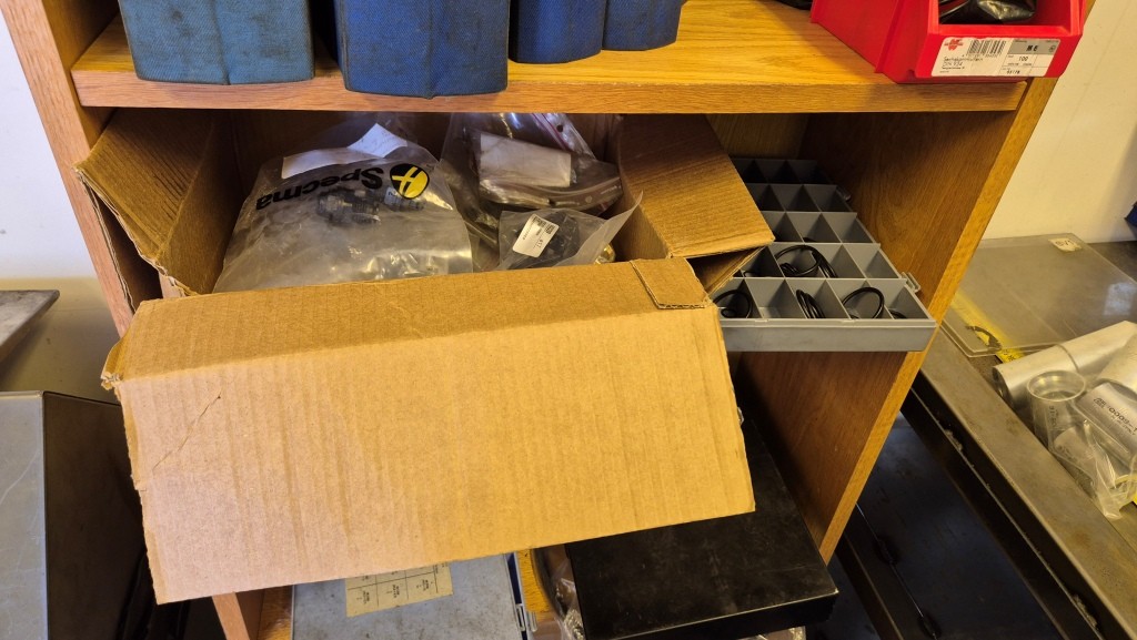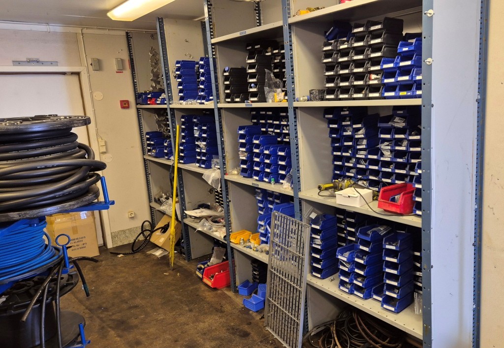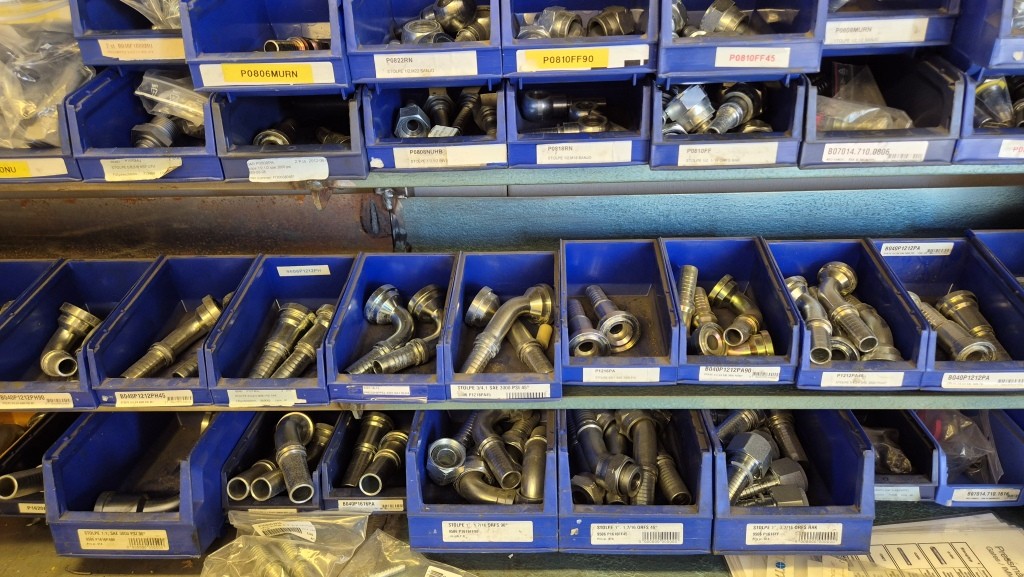 Slangverkstad med kopplingar, slang, detaljer för tillverkning av hydraulslang, slangbänk, lagerhyllor, plockbacklådor.Maskiner för slangtillverkning finns ej. Inventering för detaljerna finns ej. Inklusive plåtskylt "Slangverkstad"Längd på bänk: 575cm