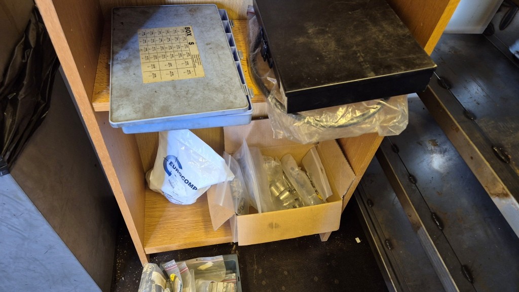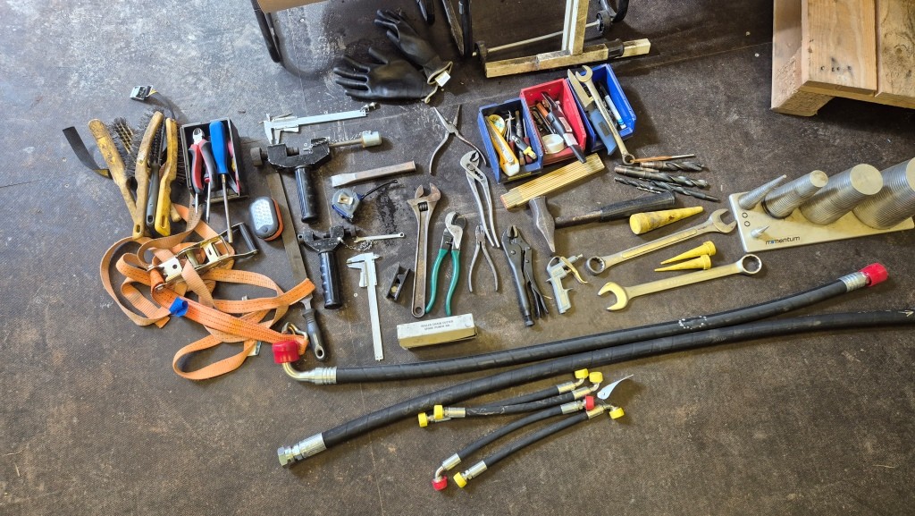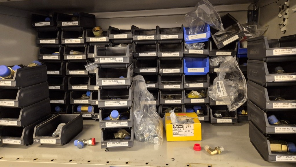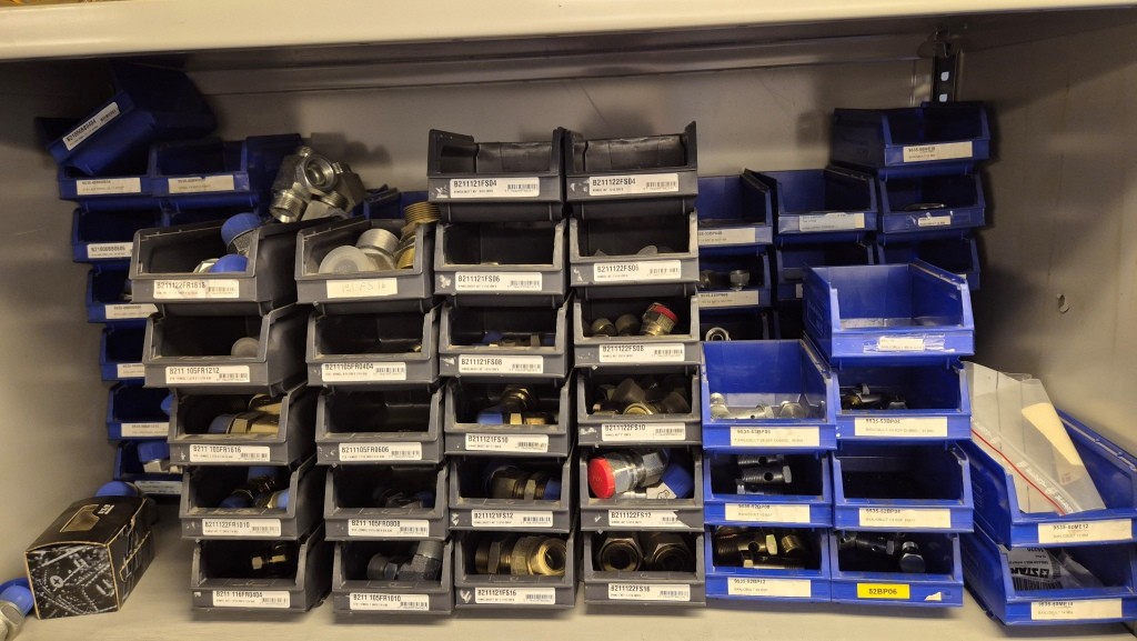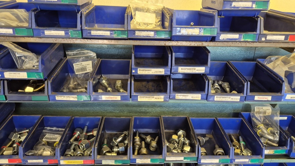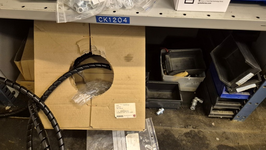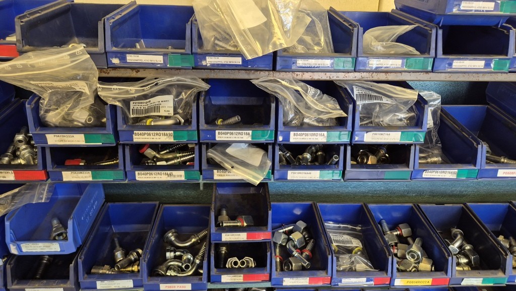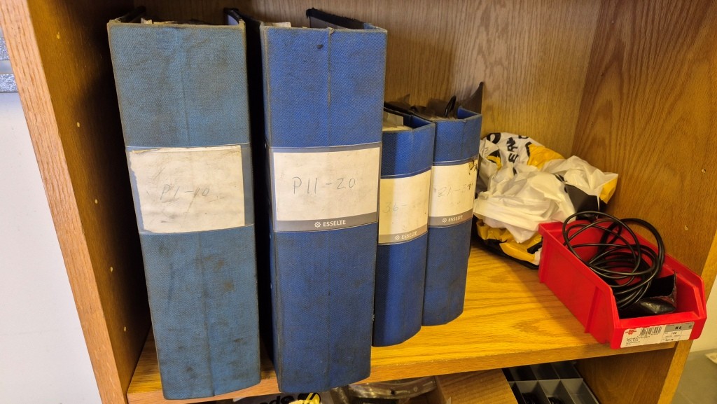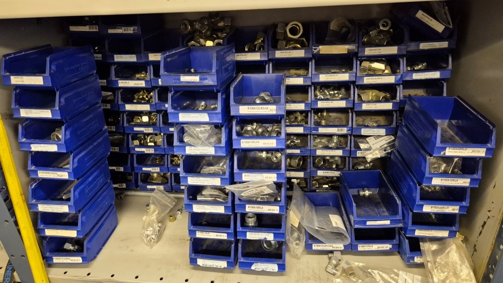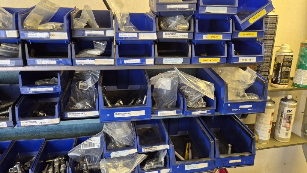 Slangverkstad med kopplingar, slang, detaljer för tillverkning av hydraulslang, slangbänk, lagerhyllor, plockbacklådor.Maskiner för slangtillverkning finns ej. Inventering för detaljerna finns ej. Inklusive plåtskylt "Slangverkstad"Längd på bänk: 575cm