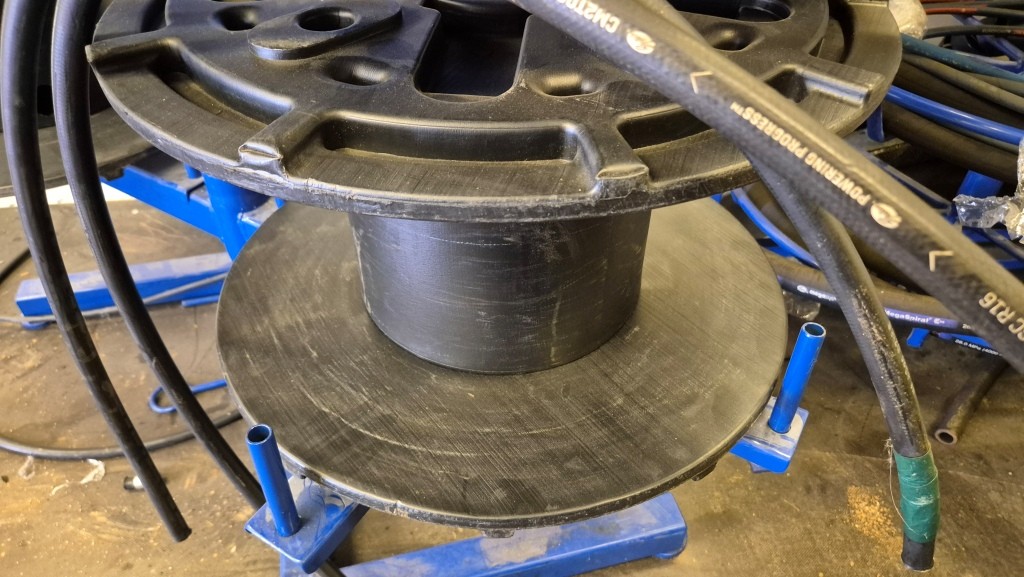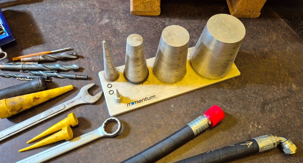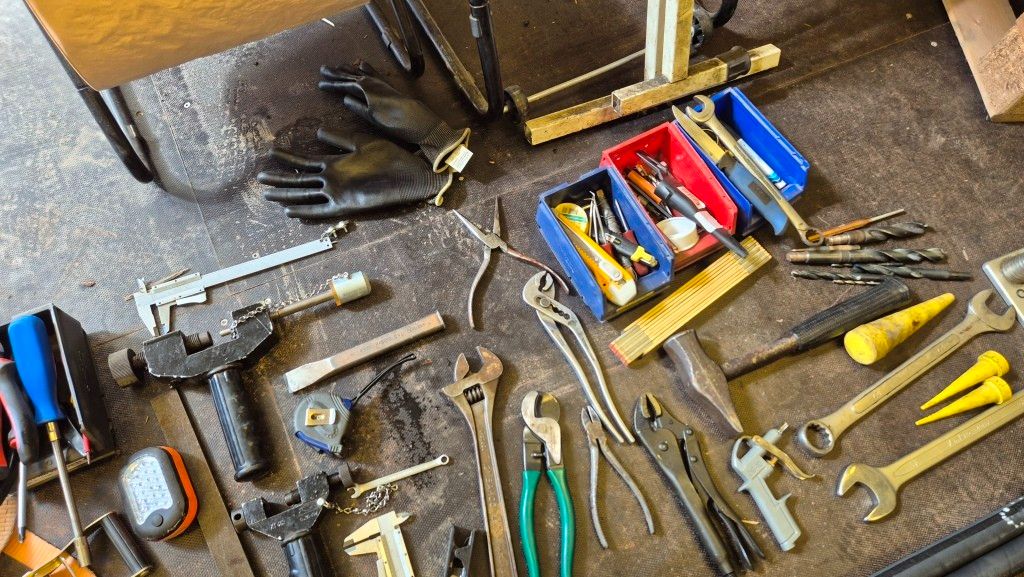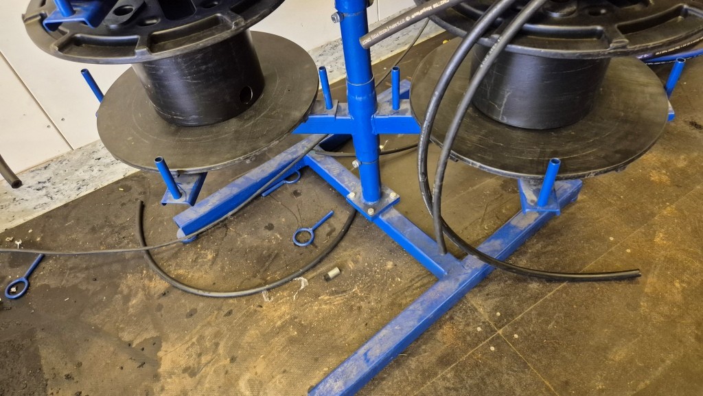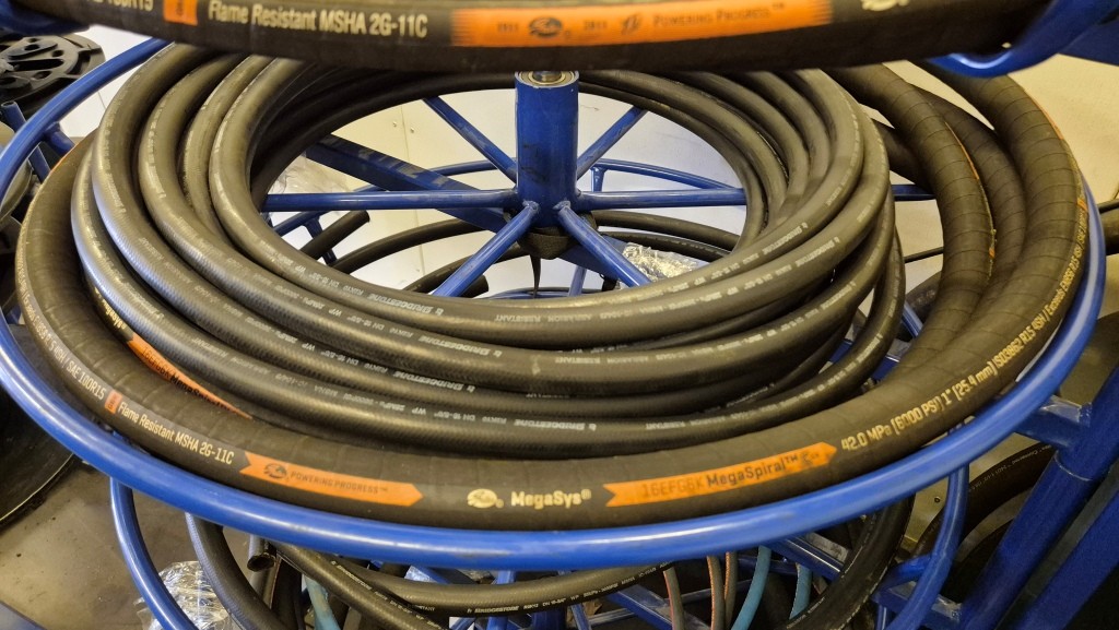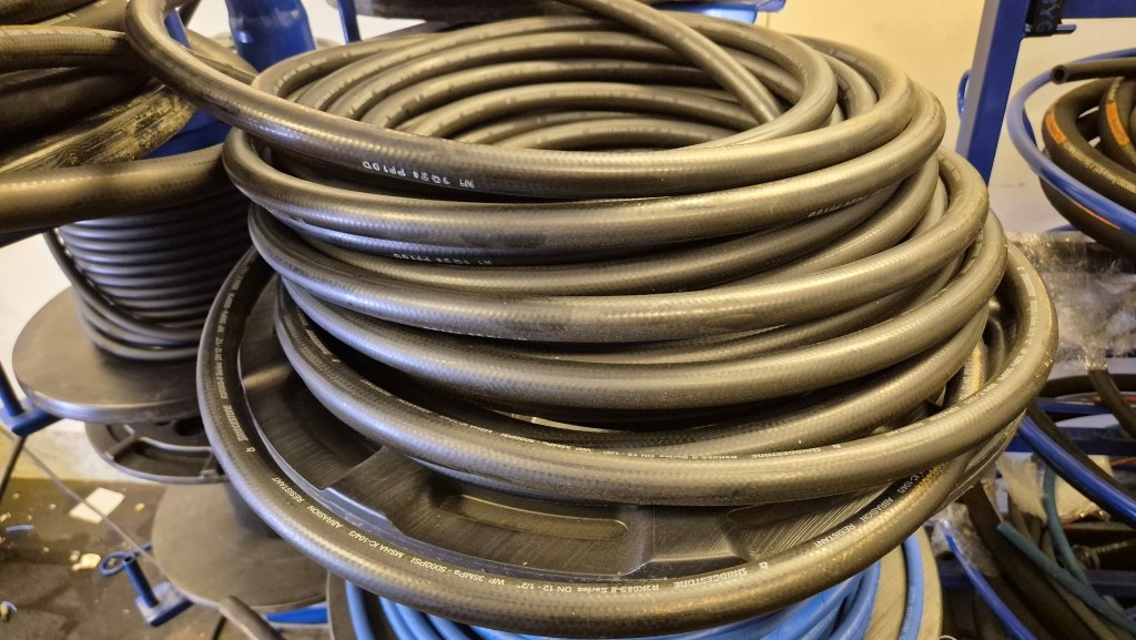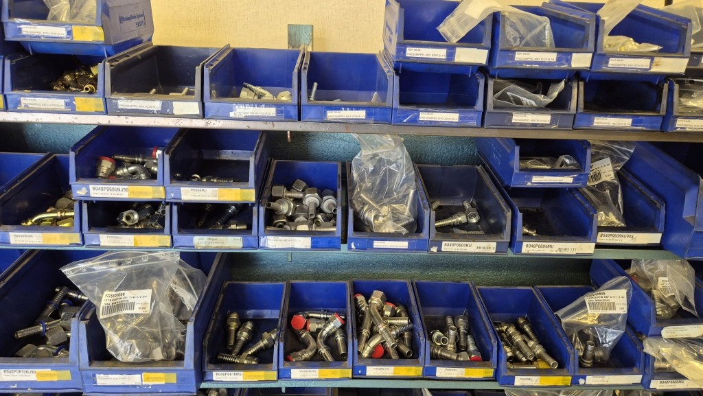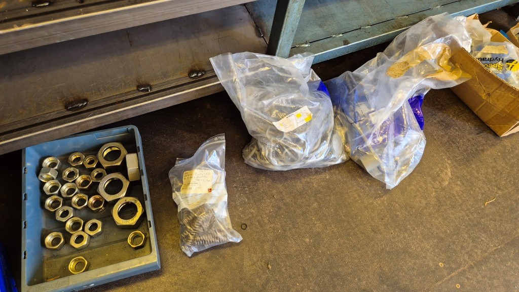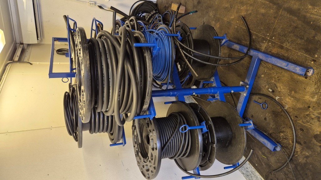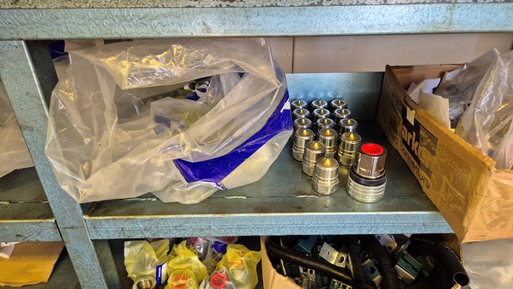 Slangverkstad med kopplingar, slang, detaljer för tillverkning av hydraulslang, slangbänk, lagerhyllor, plockbacklådor.Maskiner för slangtillverkning finns ej. Inventering för detaljerna finns ej. Inklusive plåtskylt "Slangverkstad"Längd på bänk: 575cm