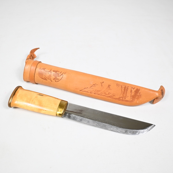 Längd inkl. slida 34 cm. Slida i läder. Samearbete.