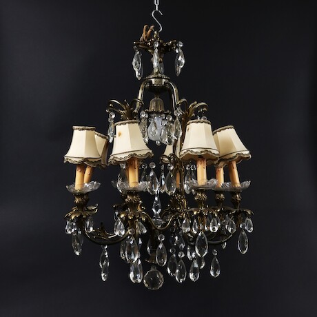 Bilder Taklampa, 1900-talets första hälft, stomme i mässing, behängd med prismor, diameter 60 cm